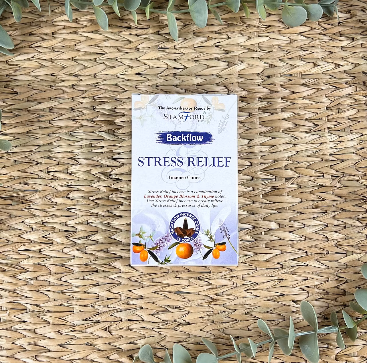 På bilden ser ni en förpackning BACKFLOW rökelsekoner från märket Stamford innehållandes ca. 15 stycken rökelsekoner av doften Stress Relief (avstressande) ✨