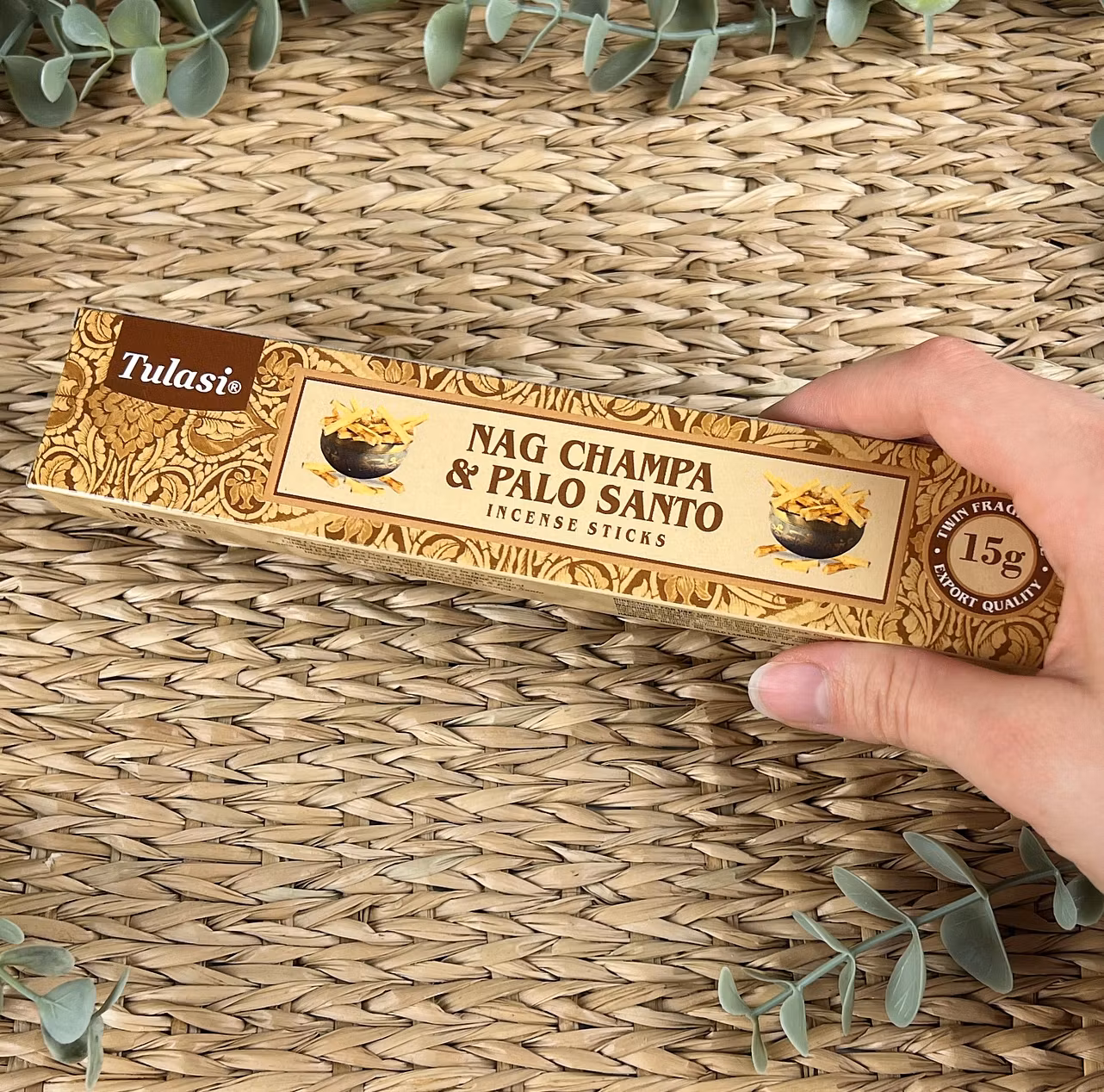På bilden ser ni en förpackning rökelsepinnar från märket Tulasi innehållandes ca. 12 stycken rökelsepinnar av doften Nag Champa och Palo Santo ✨