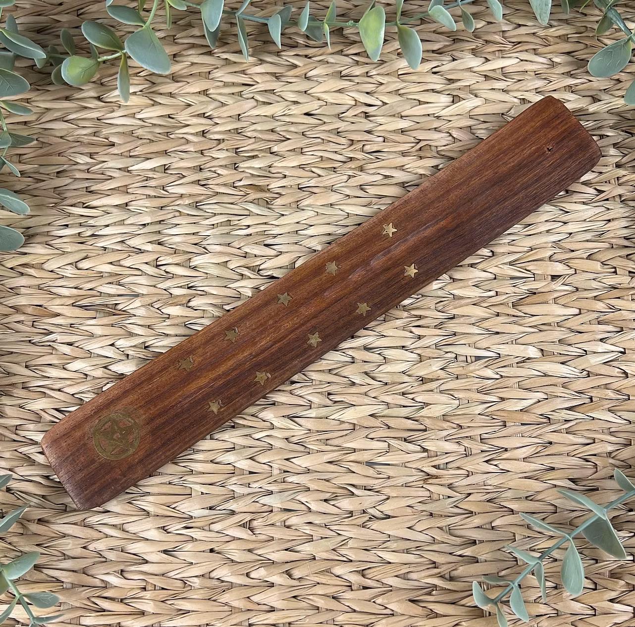 På bilden ser du en rökelsehållare i sheeshamträ i formen av en skida med små stjärnor i mässing. Den ena kortsidan av hållaren har ett emblem av mässing i form av ett pentagram och på den andra kortsidan sitter hålet där du placerar rökelsepinnen.