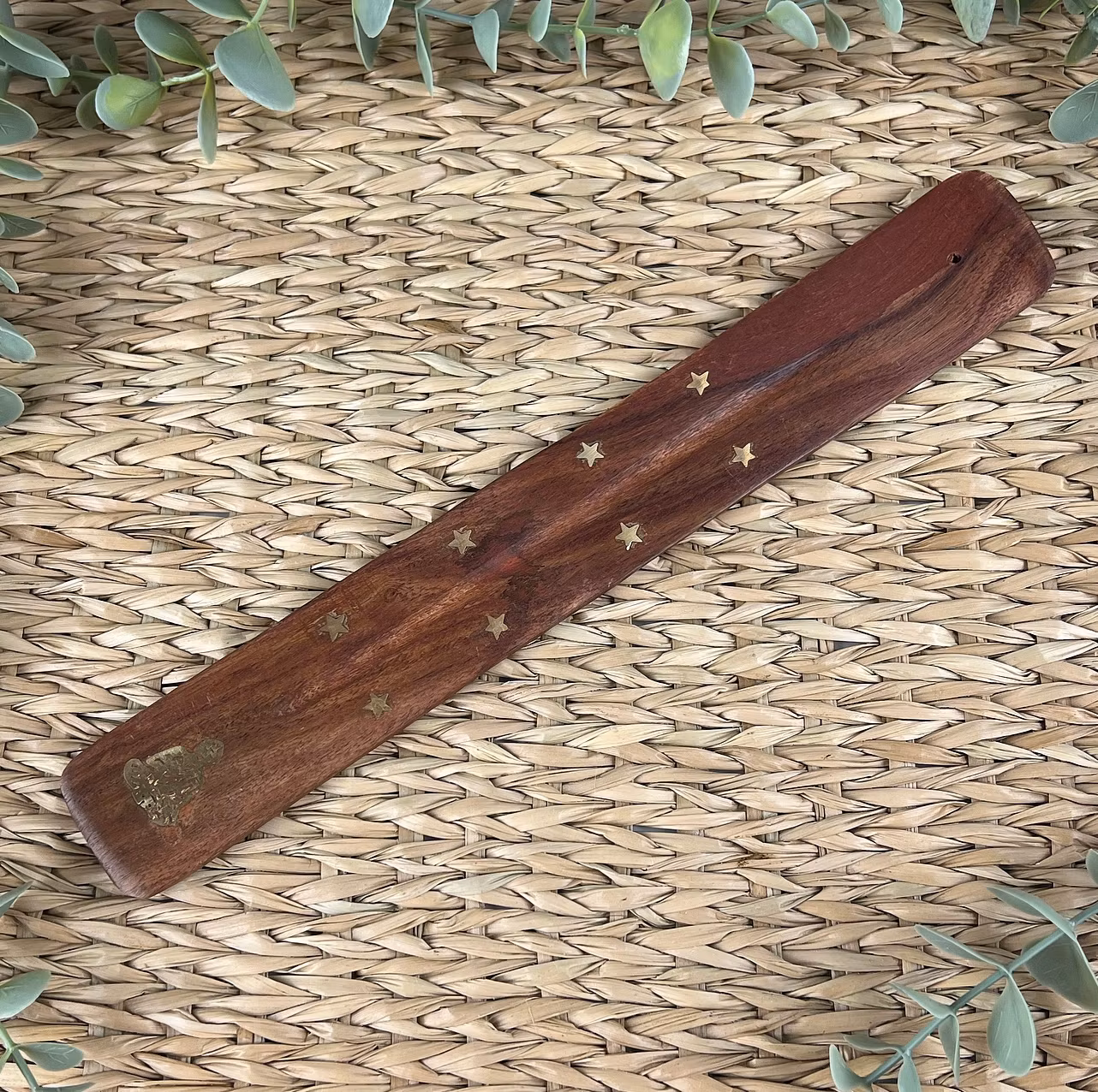 På bilden ser du en rökelsehållare i sheeshamträ i formen av en skida med små stjärnor i mässing. Den ena kortsidan av hållaren har ett emblem av mässing i form av en Buddha och på den andra kortsidan sitter hålet där du placerar rökelsepinnen.
