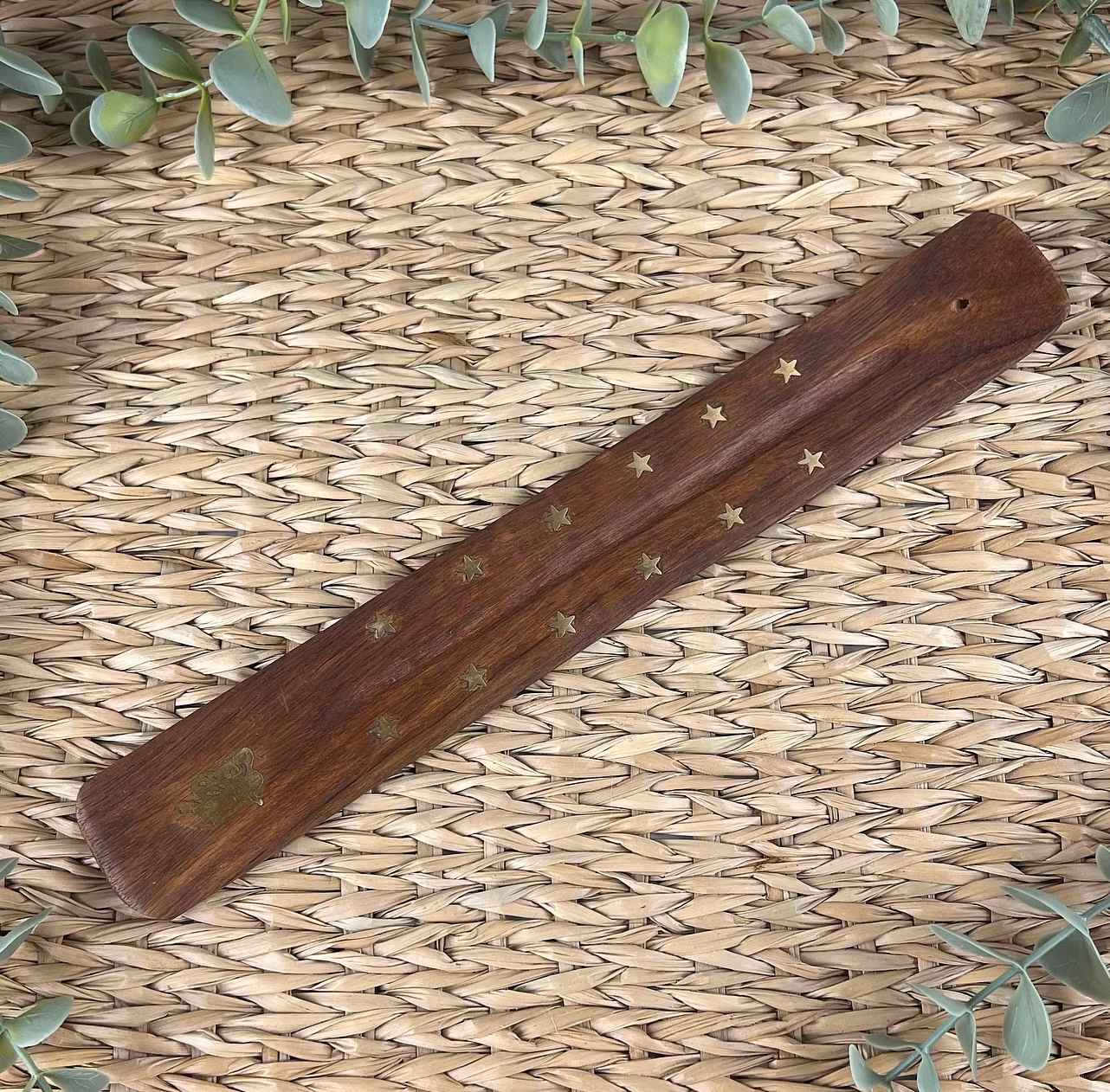 På bilden ser du en rökelsehållare i sheeshamträ i formen av en skida med små stjärnor i mässing. Den ena kortsidan av hållaren har ett emblem av mässing i form av en älva och på den andra kortsidan sitter hålet där du placerar rökelsepinnen.