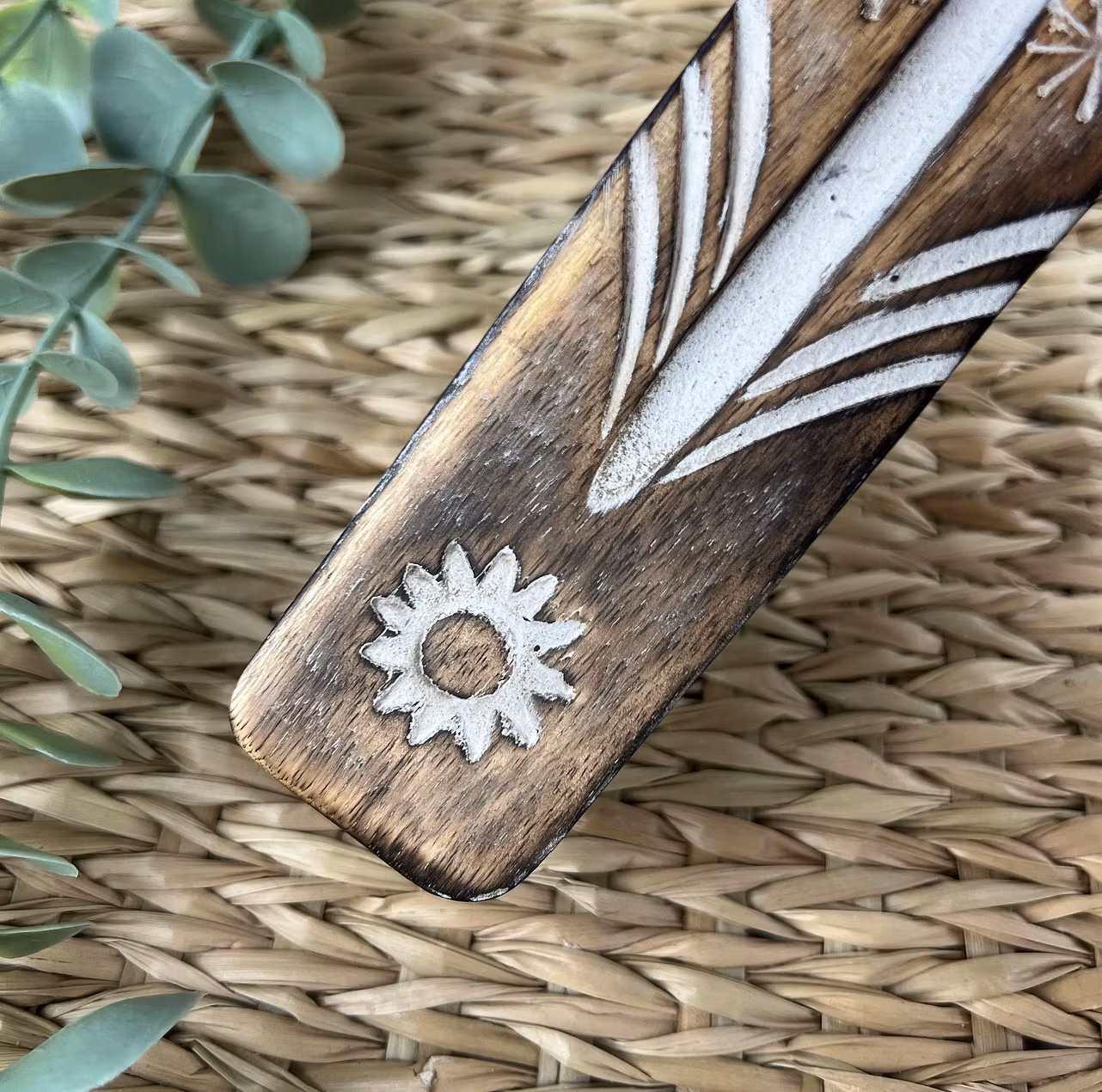 På bilden ser du en rökelsehållare i mangoträ i formen av en skida med en sol och andra fina detaljer. Hållaren är både snidad och målad för hand.