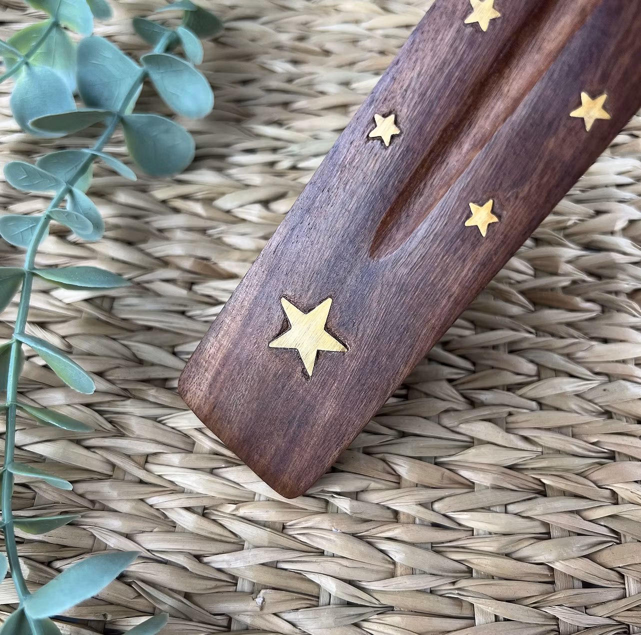 På bilden ser du en rökelsehållare i sheeshamträ i formen av en skida med små stjärnor i mässing. Den ena kortsidan av hållaren har ett emblem av mässing i form av en stjärna och på den andra kortsidan sitter hålet där du placerar rökelsepinnen.