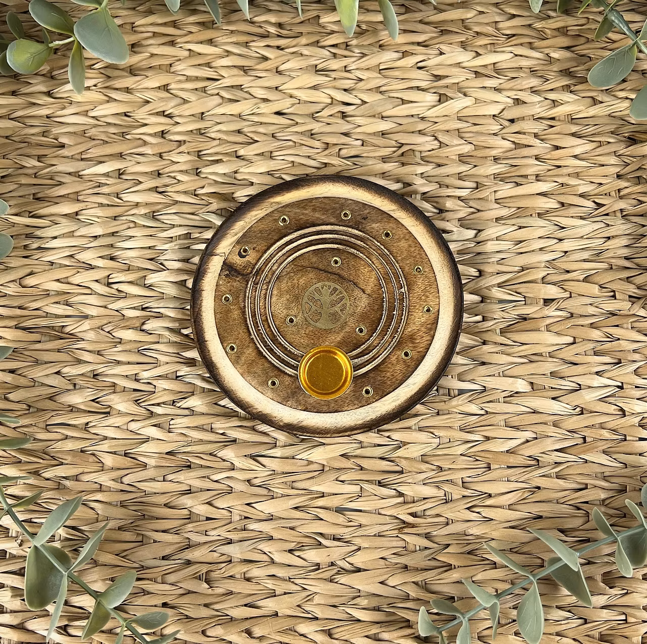 På bilden ser du en cirkelformad rökelsehållare i mangoträ.