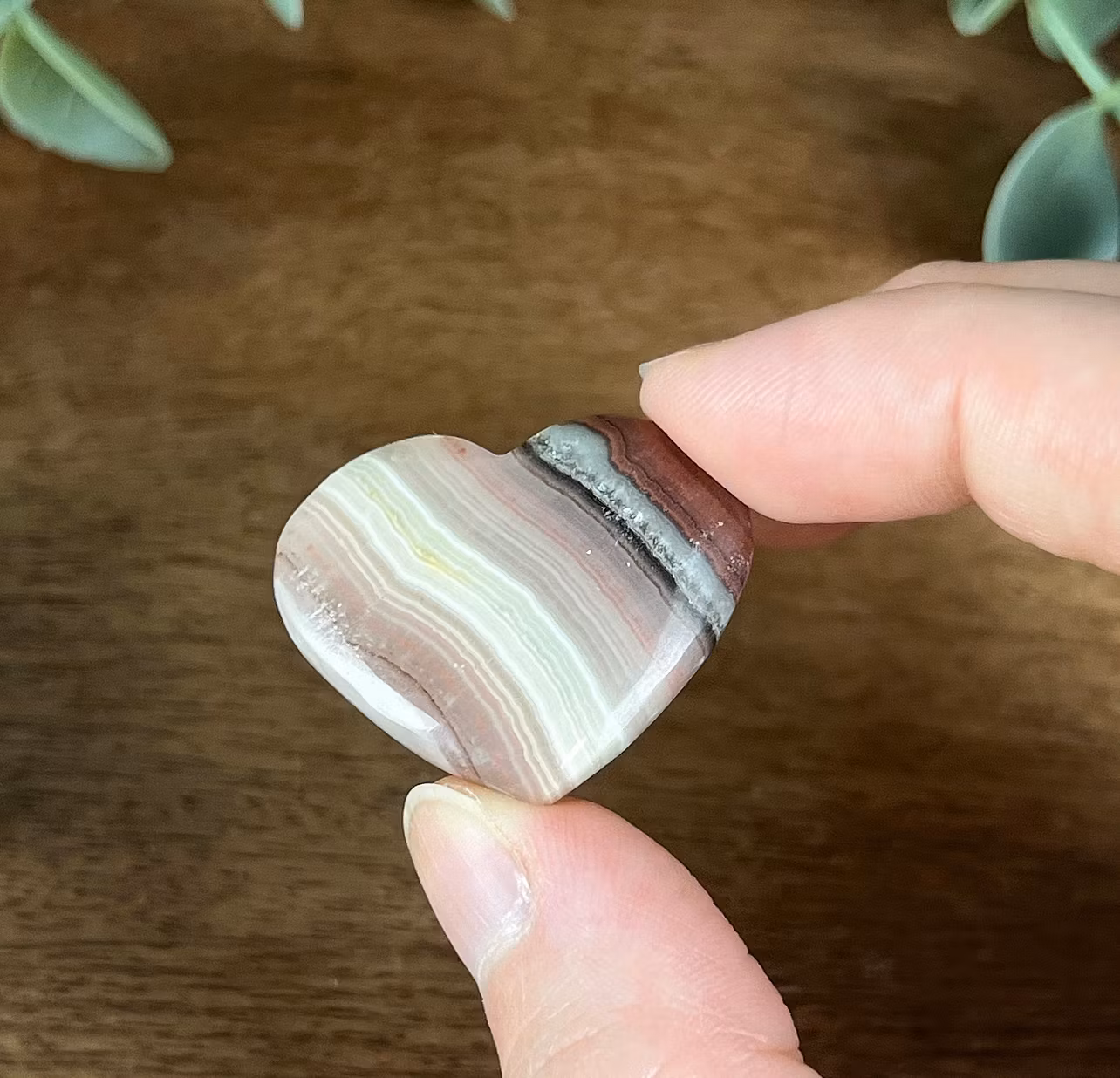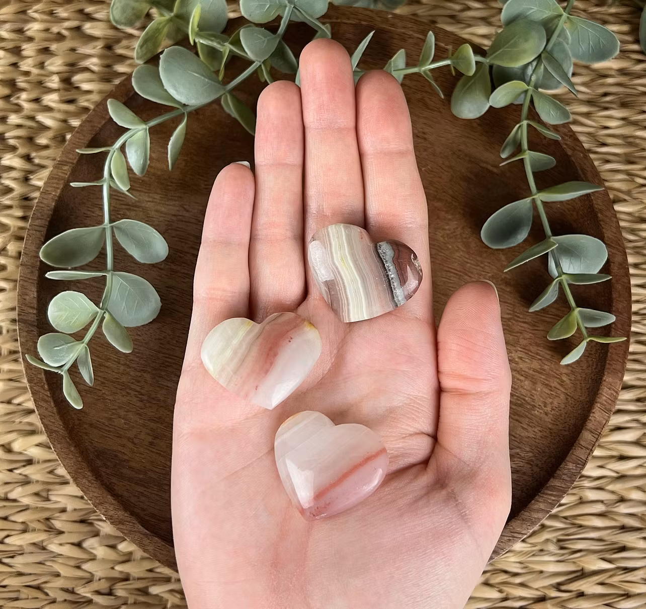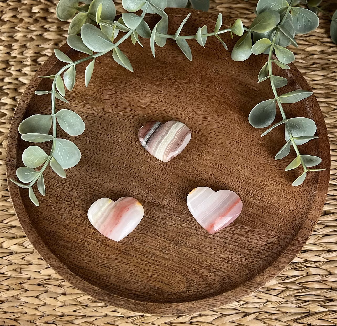 På bilden ser ni hjärtan av Bandad Rosa kalcit av god kvalitét