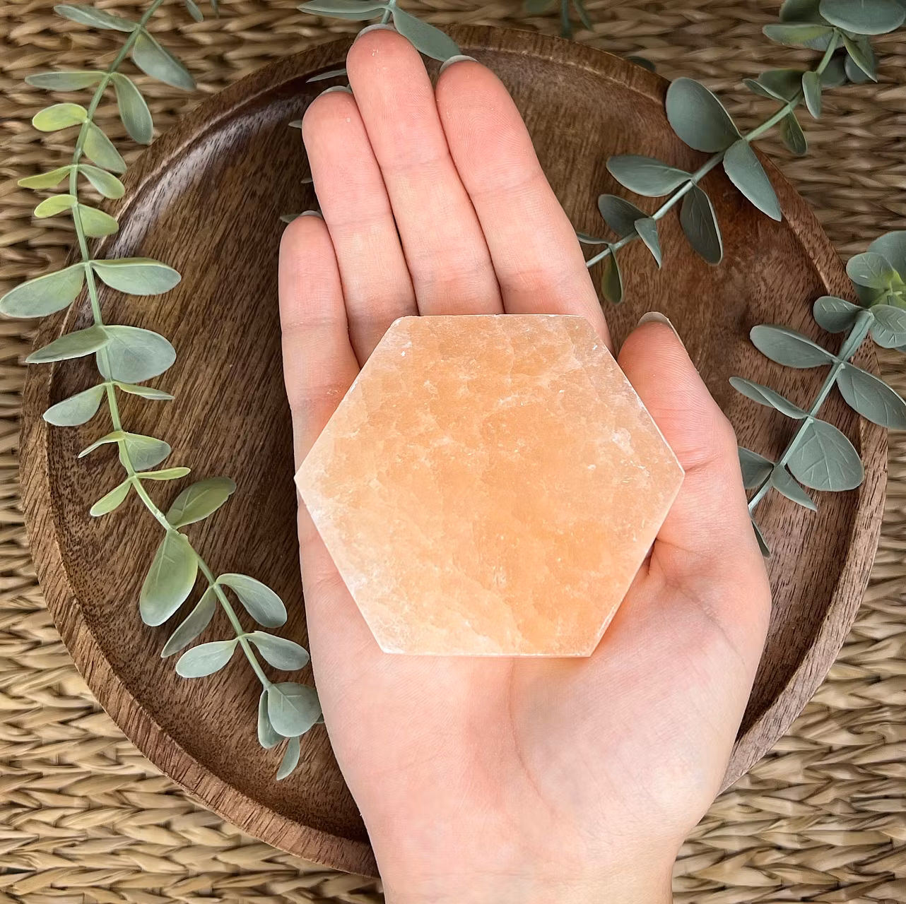 På bilden ser ni en hexagonformad laddningsplatta av orange Selenit (eller satinspat som den även heter)