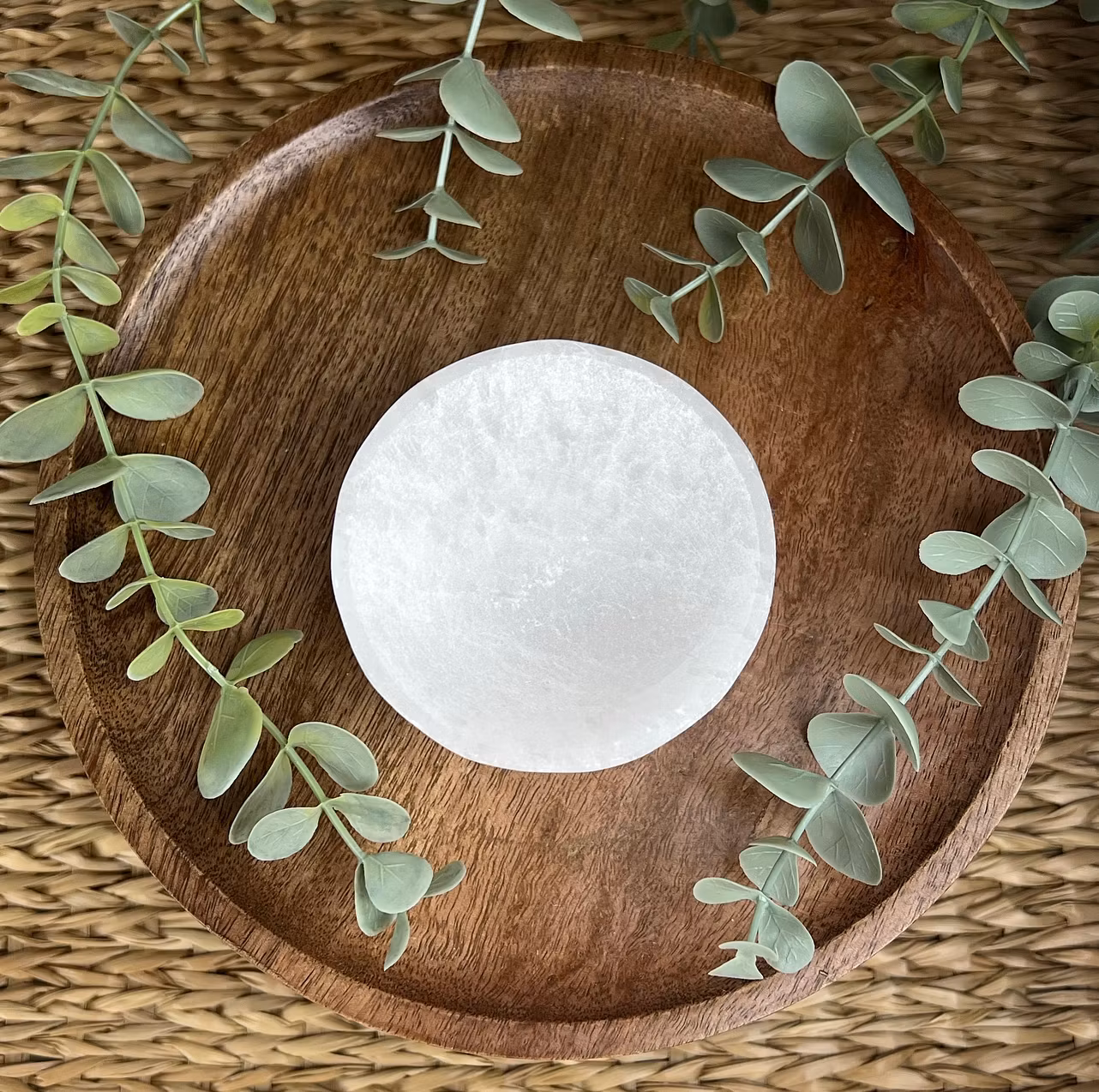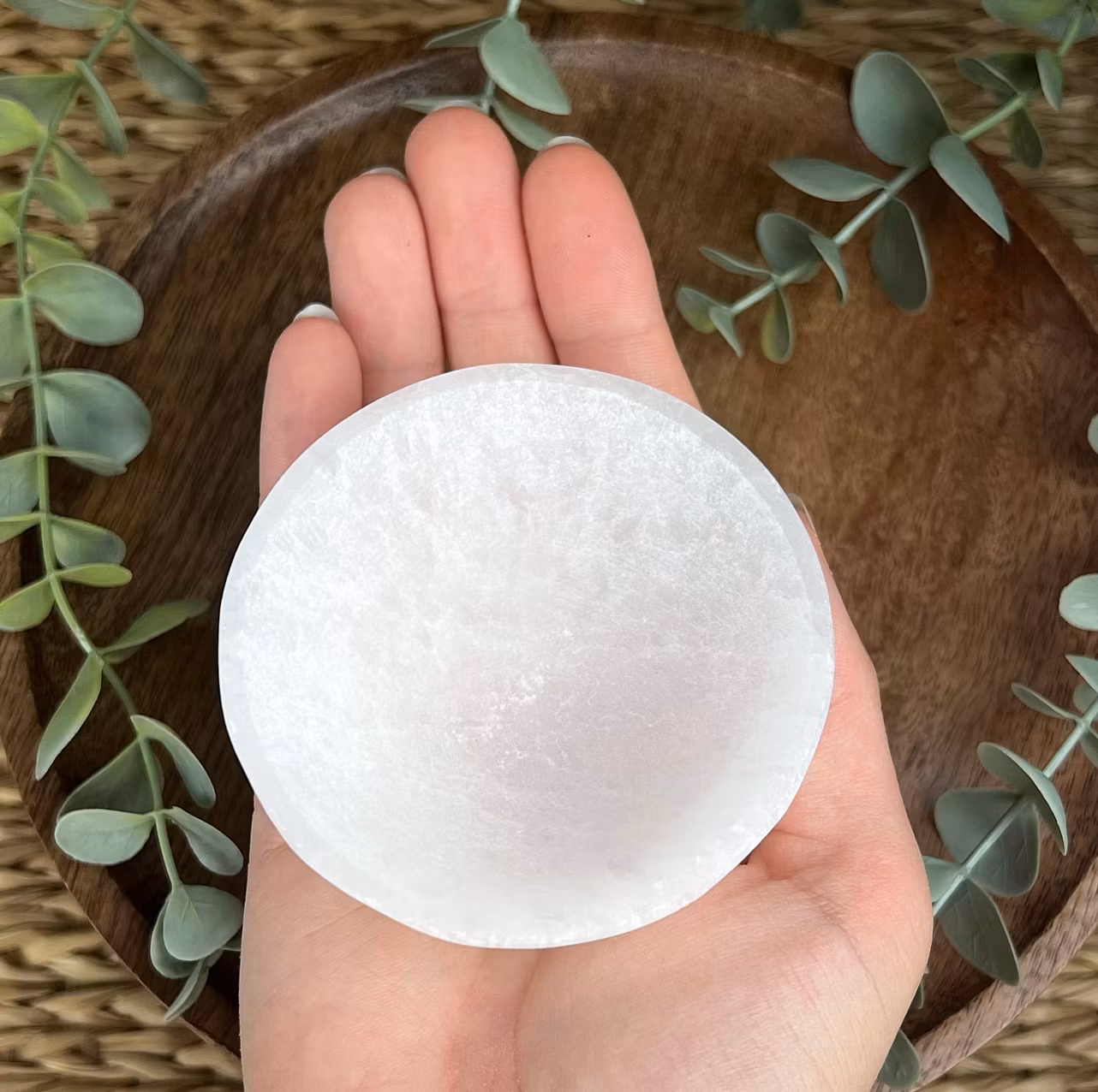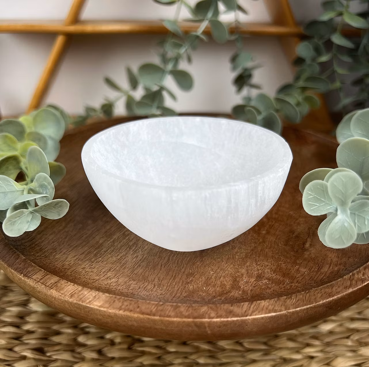 På bilden ser ni en skål av vit Selenit (eller satinspat som den även heter)