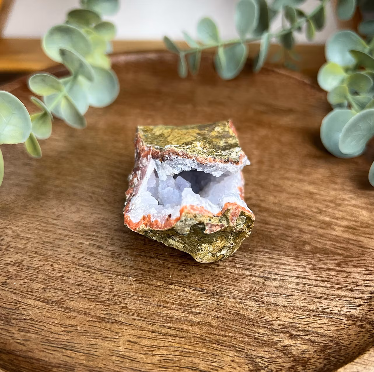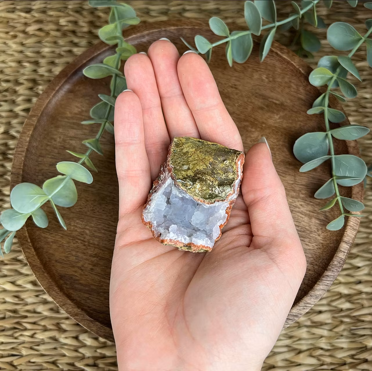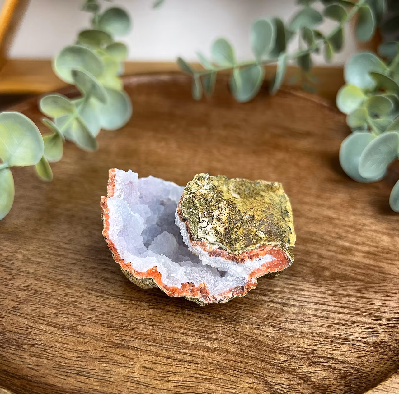 På bilden ser ni en bit av en geod av Berberagat av himla fin kvalitet. Ett kännetecken för just denna agaten är det starkt orange/röda bandet runt kvarts och kalcedon som går i både vita, rosa och lila toner.
