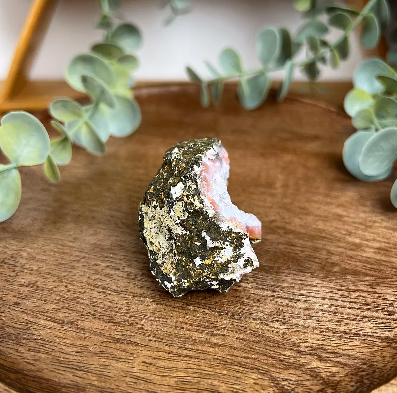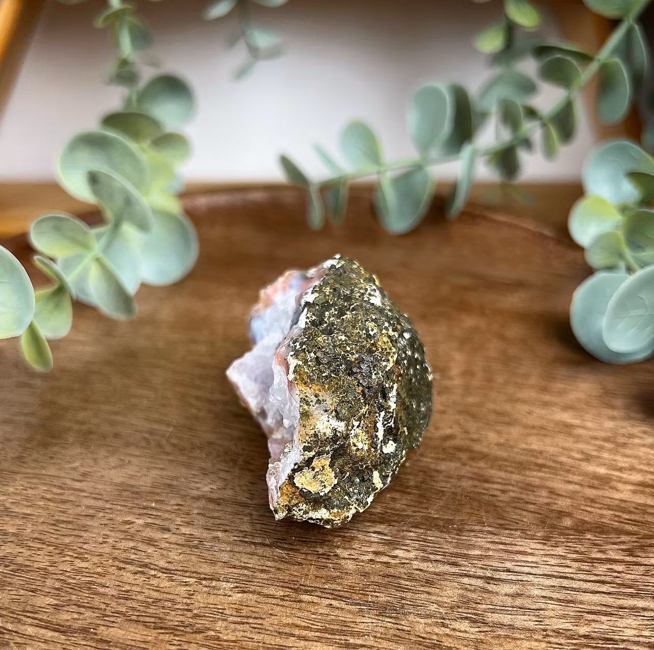 På bilden ser ni en bit av en geod av Berberagat av himla fin kvalitet. Ett kännetecken för just denna agaten är det starkt orange/röda bandet runt kvarts och kalcedon som går i både vita, rosa och lila toner.