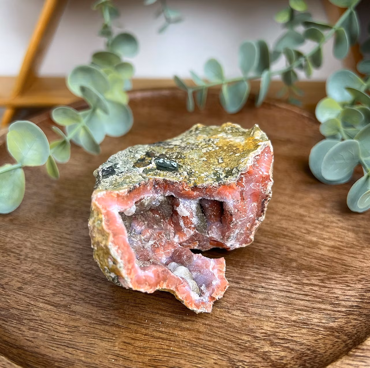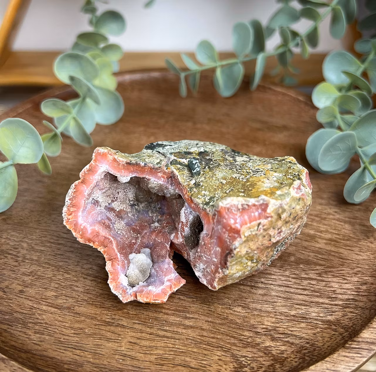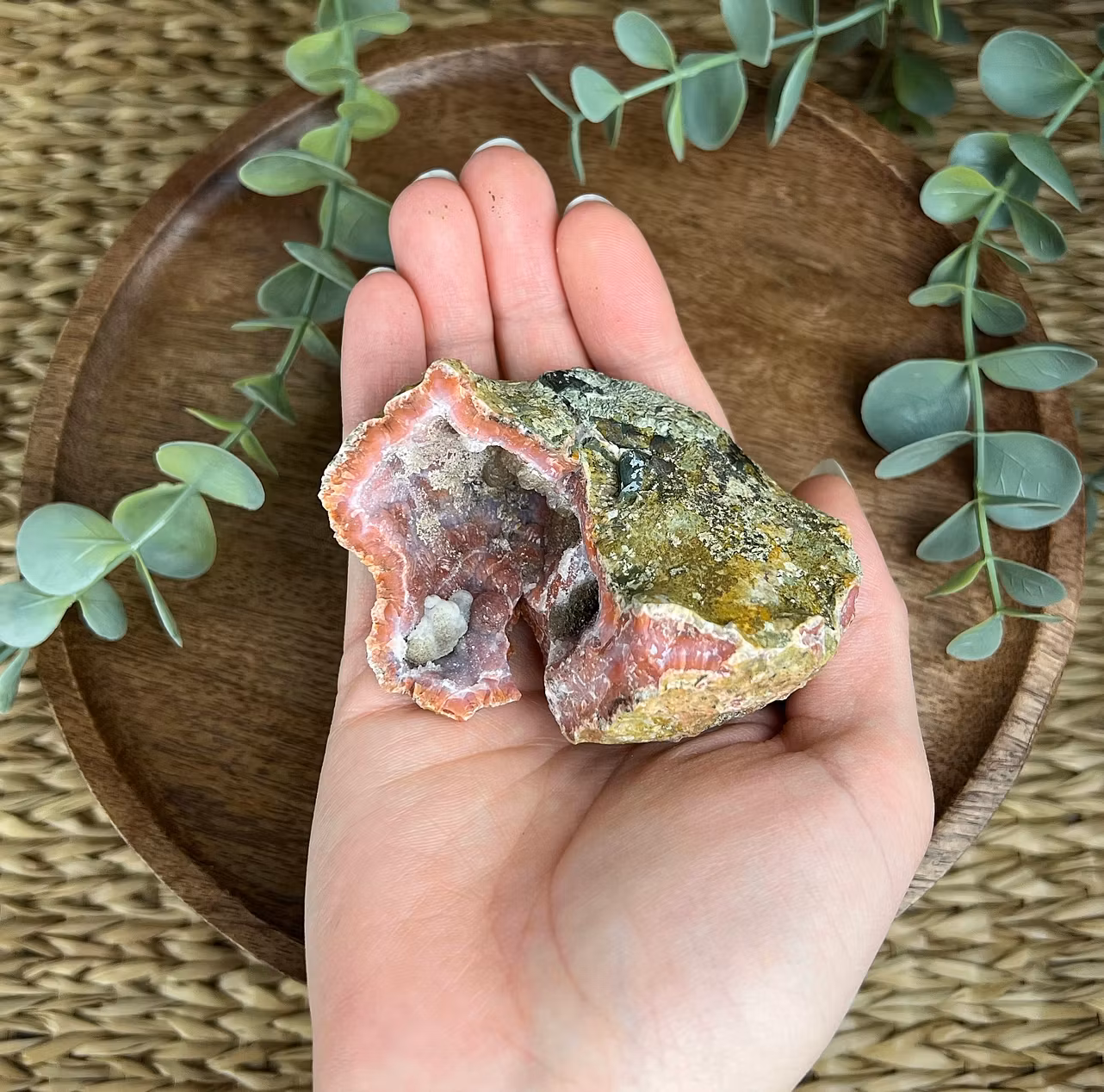 På bilden ser ni en bit av en geod av Berberagat av himla fin kvalitet. Ett kännetecken för just denna agaten är det starkt orange/röda bandet runt kvarts och kalcedon som går i både vita, rosa och lila toner.