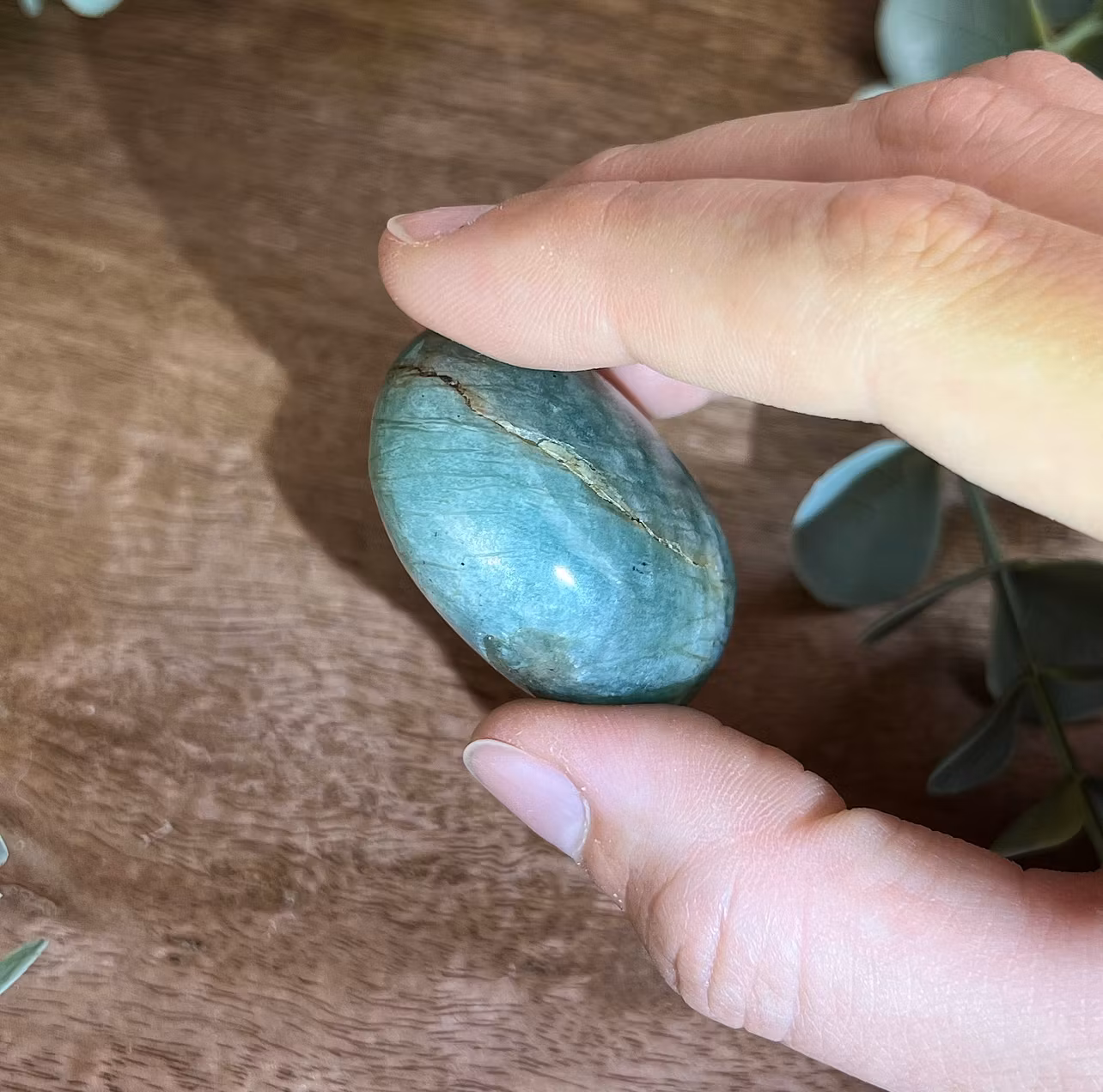 På bilden ser ni en meditationssten (handsten) av Amazonit