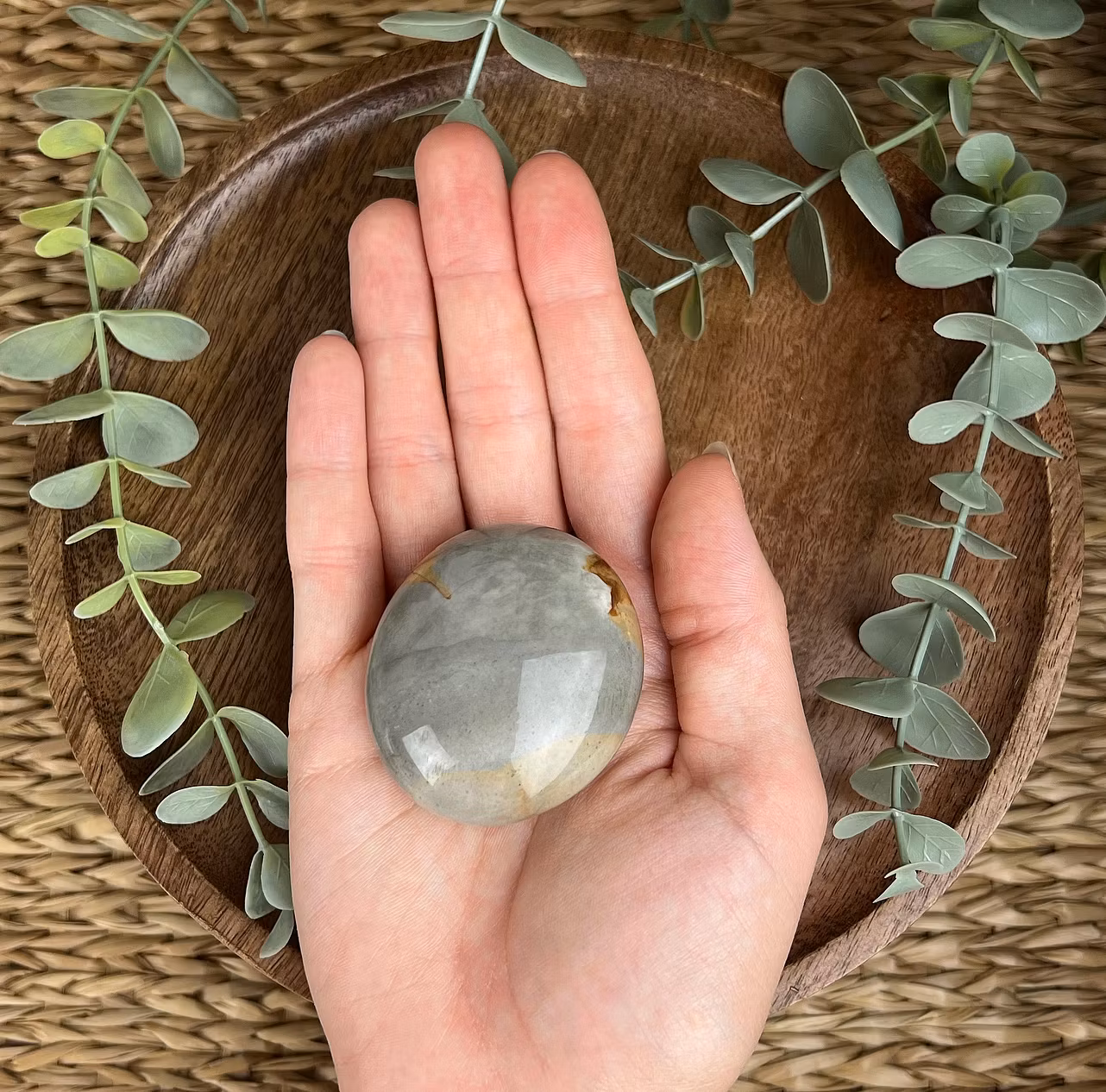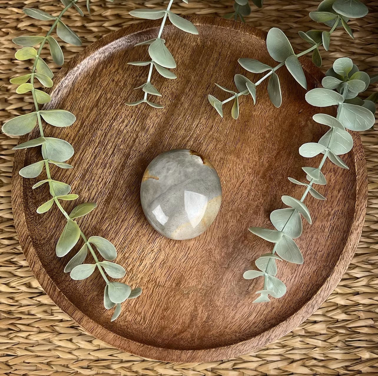 På bilden ser ni en meditationssten (handsten) av polykromjaspis