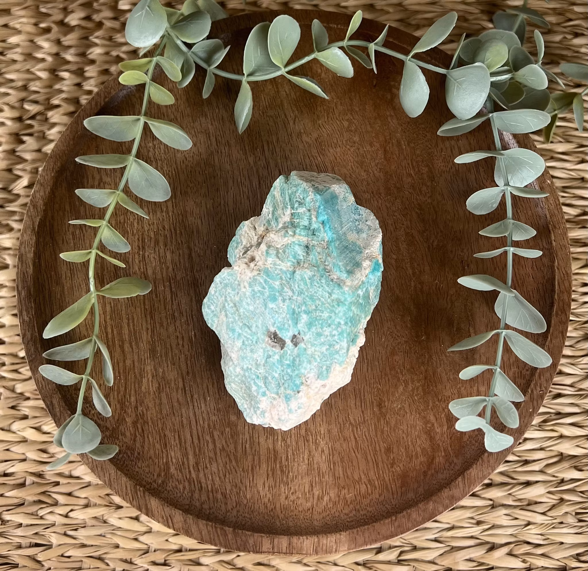 På bilden ser ni en rå bit av Amazonit med lite rökkvarts (de mörkare fälten) 💙