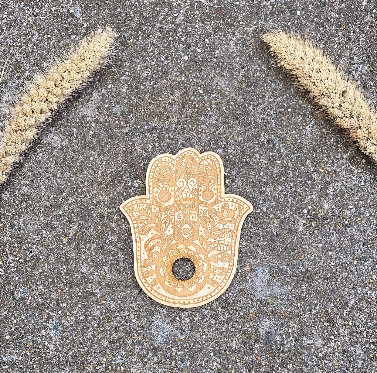 På bilden ser ni ett klotställ i form av Fatimas hand samt växter och ett litet öga.