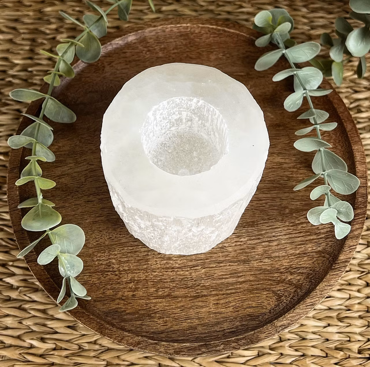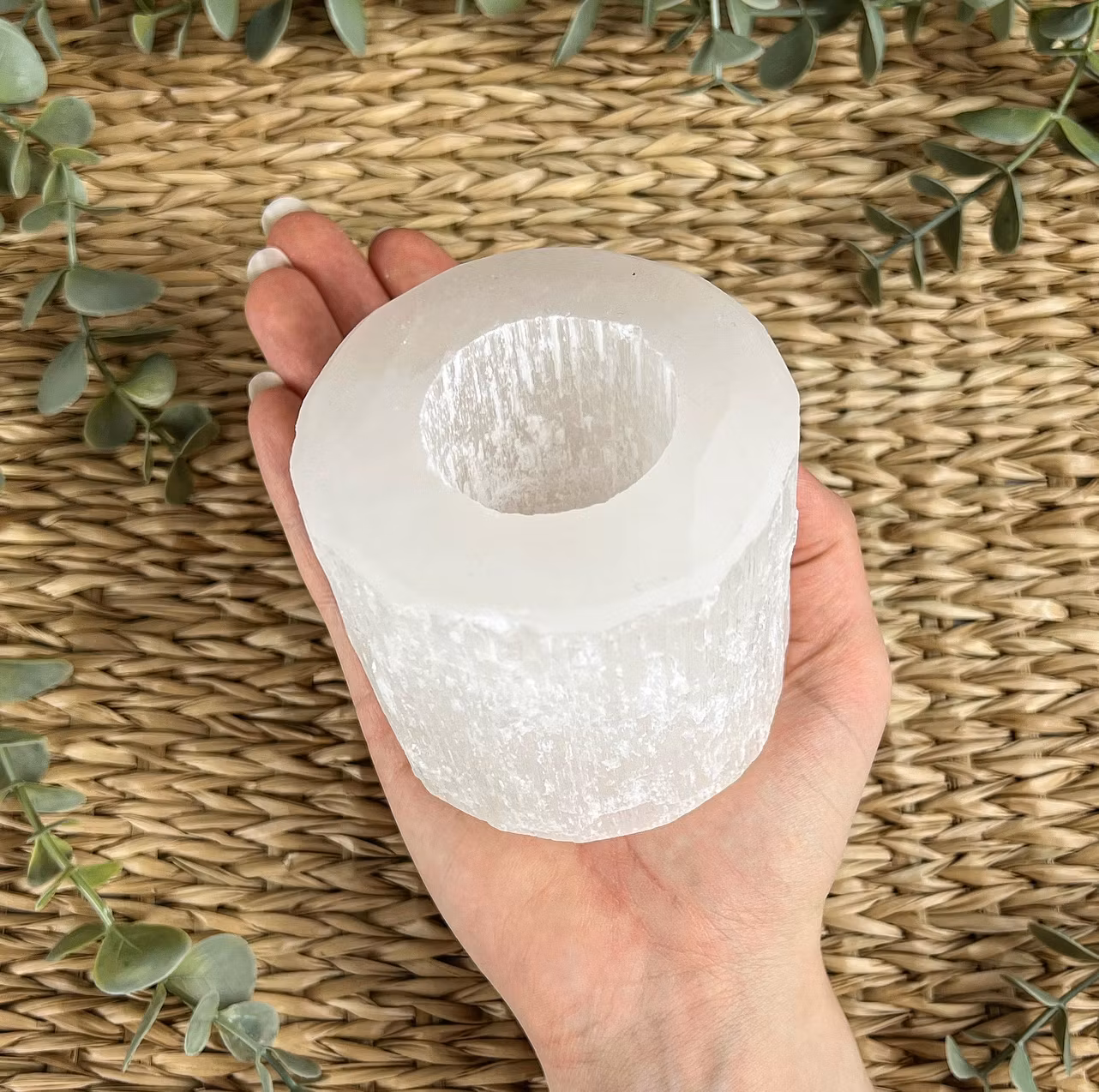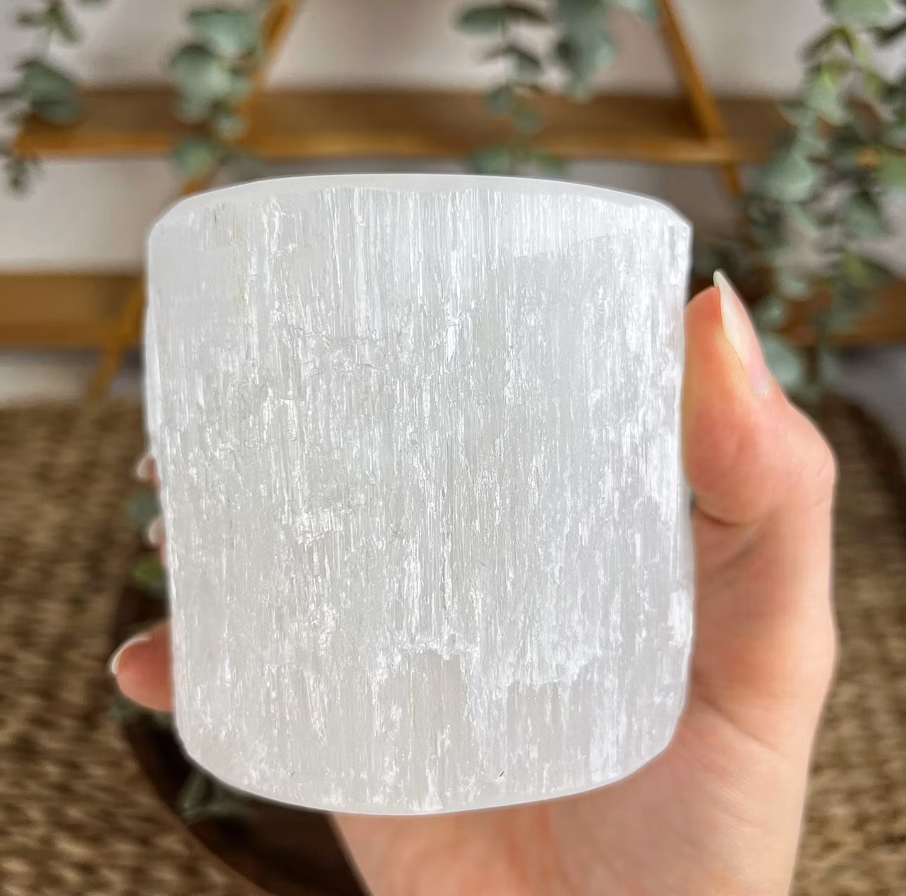På bilden ser ni en cylinderformad ljuslykta av selenit (satin spat). Den är polerad på översidan och undersidan och rå på utsidan.