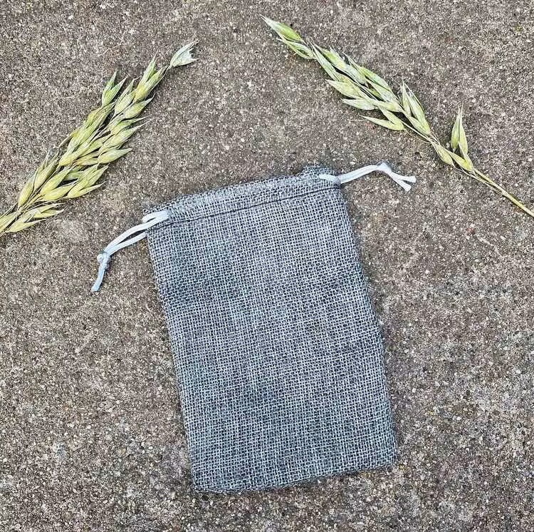 På bilden ser ni en lite större grå påse i juteimitation som passar ypperligt till att förvara exempelvis smycken eller mindre stenar i ☺️