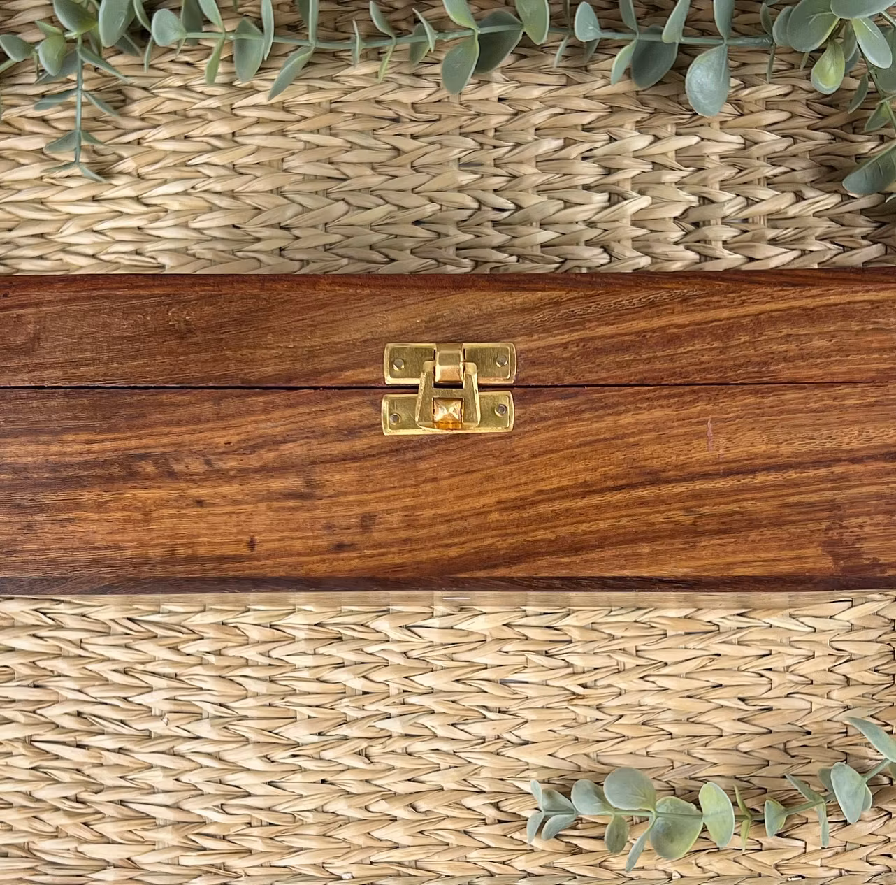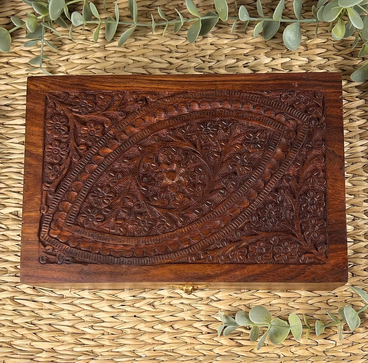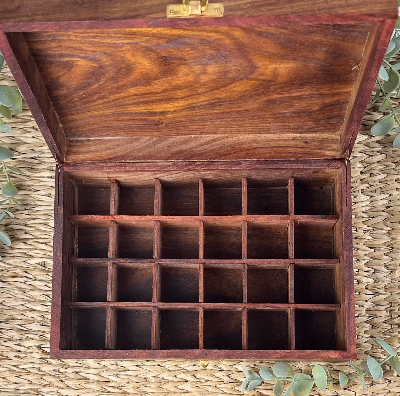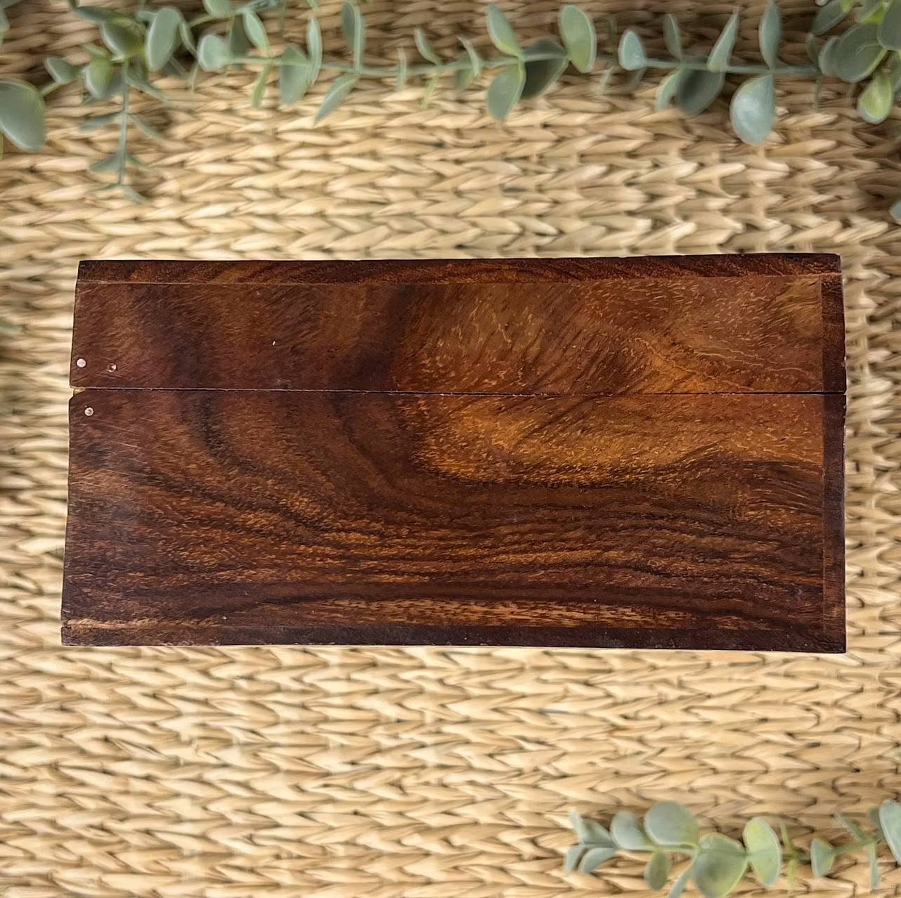 Träskrin (handsnidad) för eterisk olja, rökelsekoner, trumlade stenar mm. (Stor)