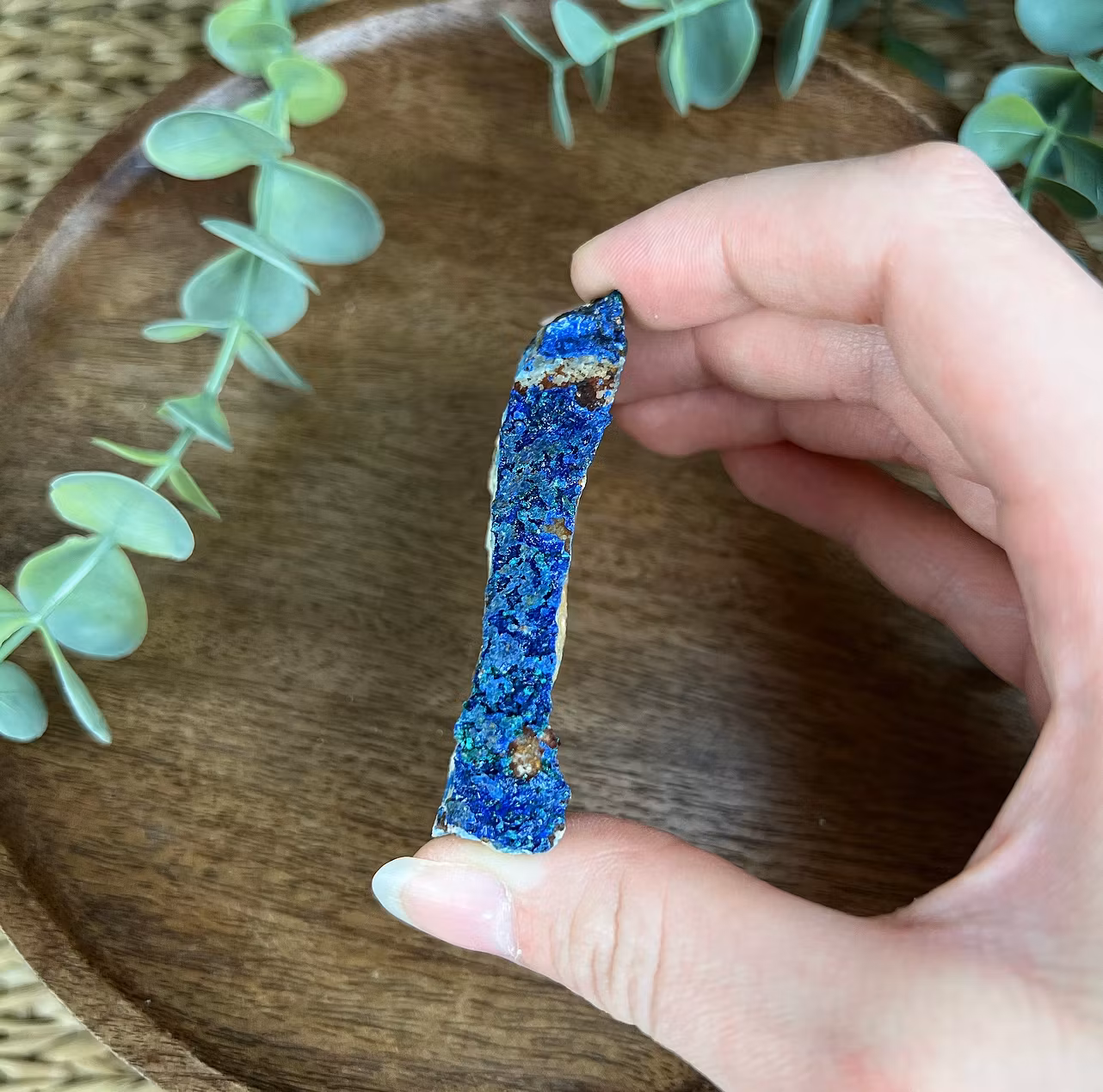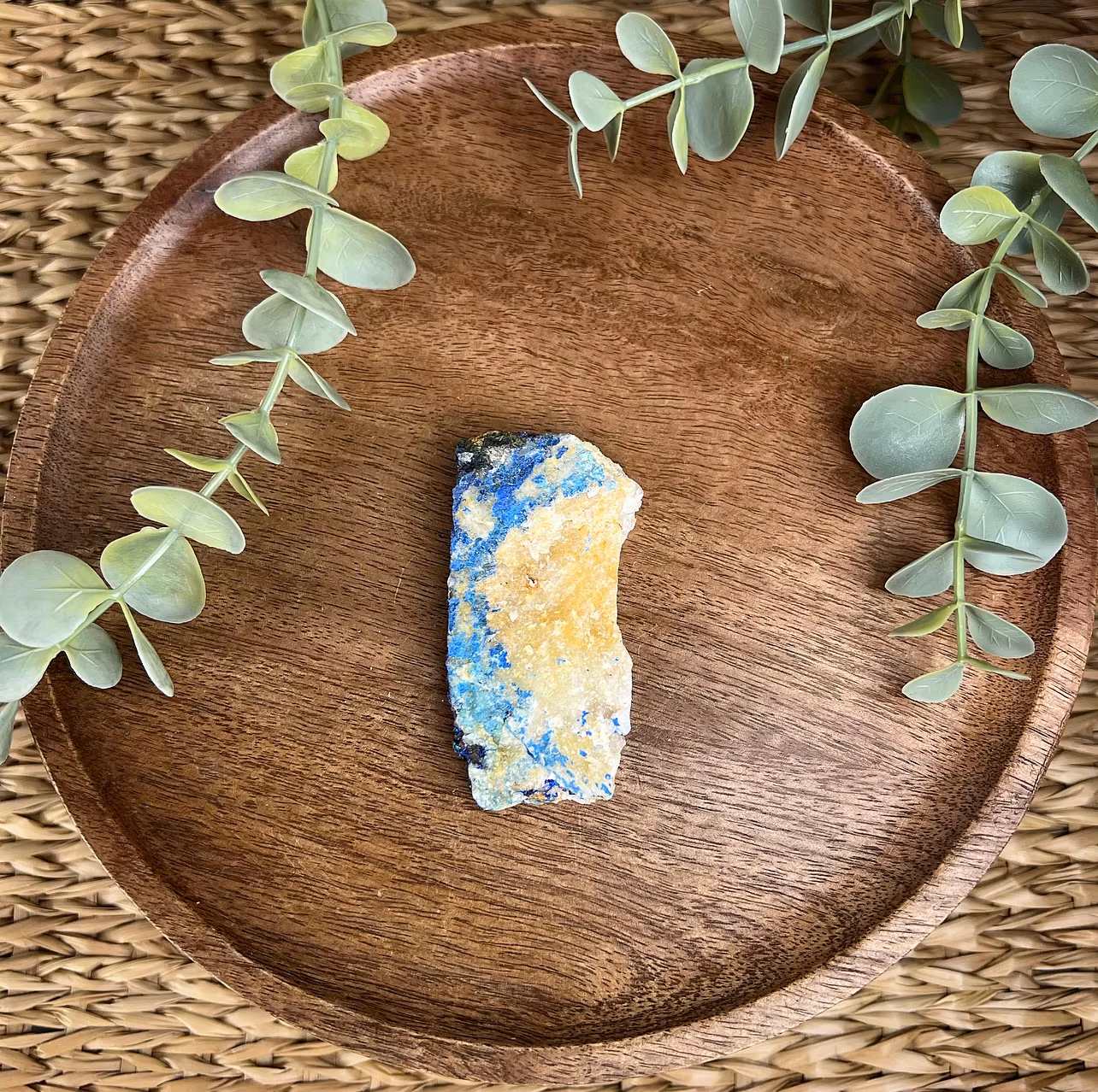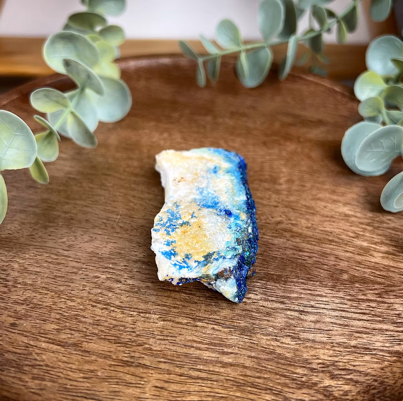 På bilden ser ni en rå bit av Azurit med några små stänk av Malakit. Både azuriten och malakiten är kopparmineraler och växer ofta tillsammans.