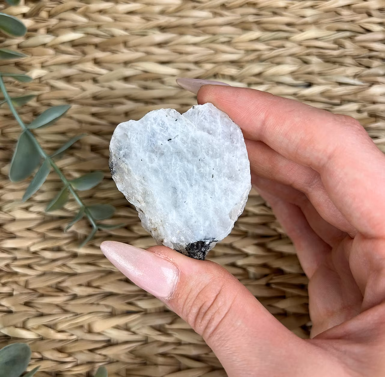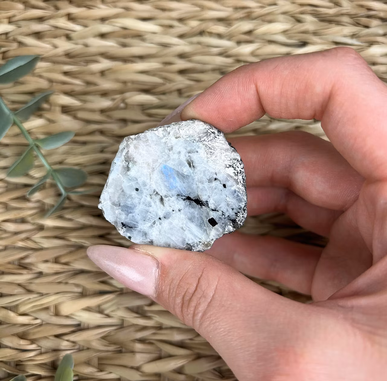 På bilden ser ni råa stenar (med en polerad sida) av regnbågsmånsten i en mellanstor storlek.
