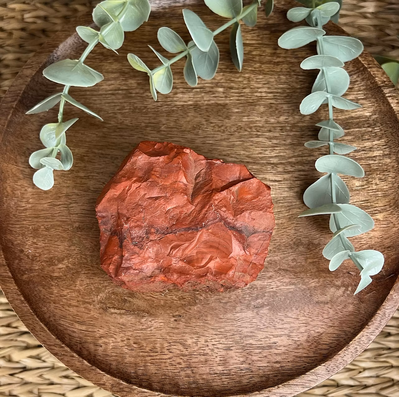 På bilden ser ni en lite större rå sten av röd jaspis.