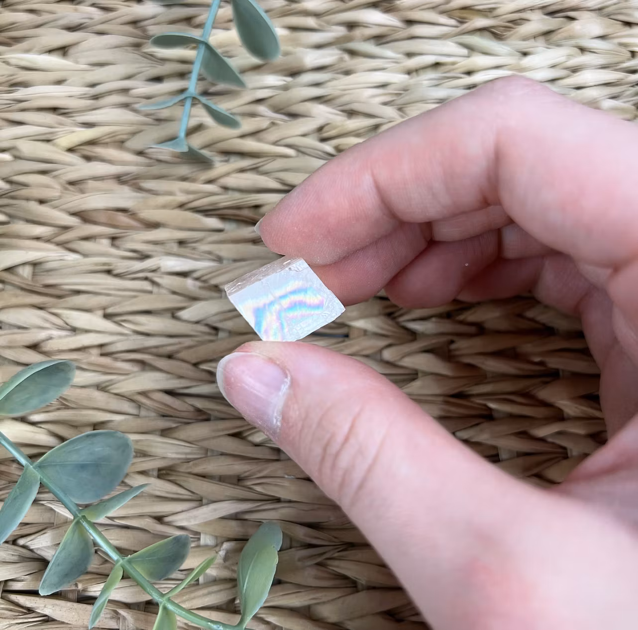 På bilden ser ni mindre råa bitar av rosa optisk kalcit (de flesta har flera regnbågar) 🌈