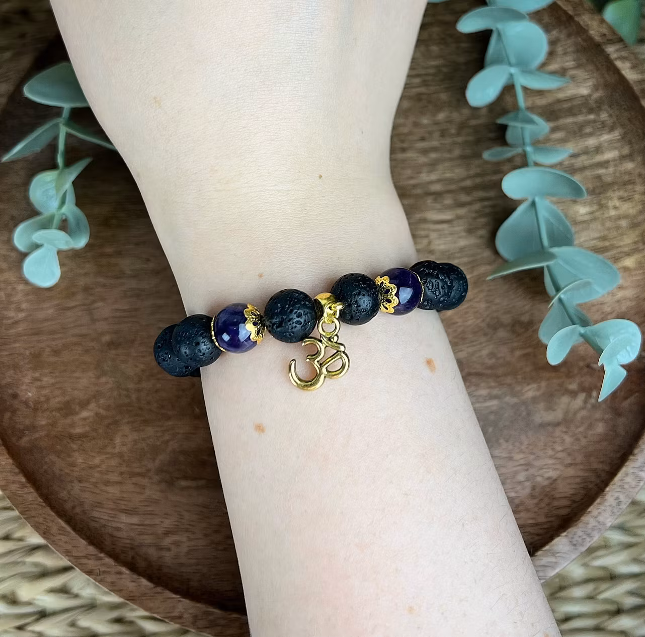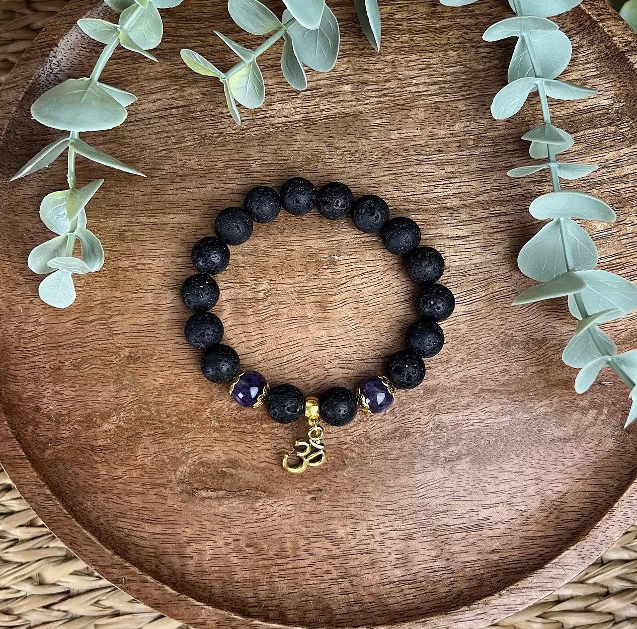 På bilden ser ni ett armband av lavasten, 2 stycken pärlor av ametist och silverpläterade detaljer.