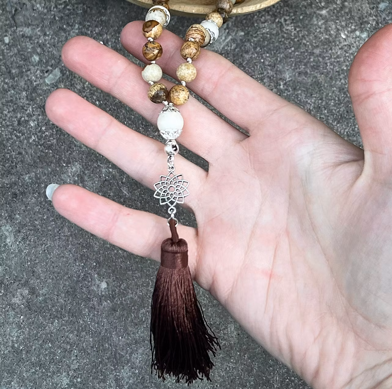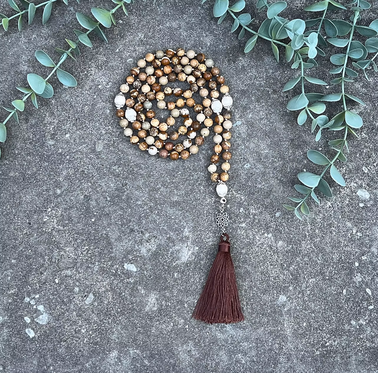 På bilden ser ni ett malahalsband av till största del bestående av Bildjaspis samt 5 stycken pärlor av Vit matt jaspis. Alla guldfärgade detaljer är nickel, bly och kadmiumfria och i slutet av malan sitter en mörkt brun tofs.