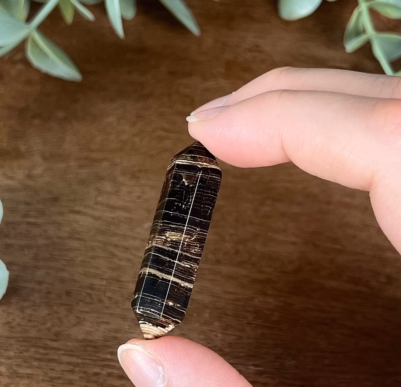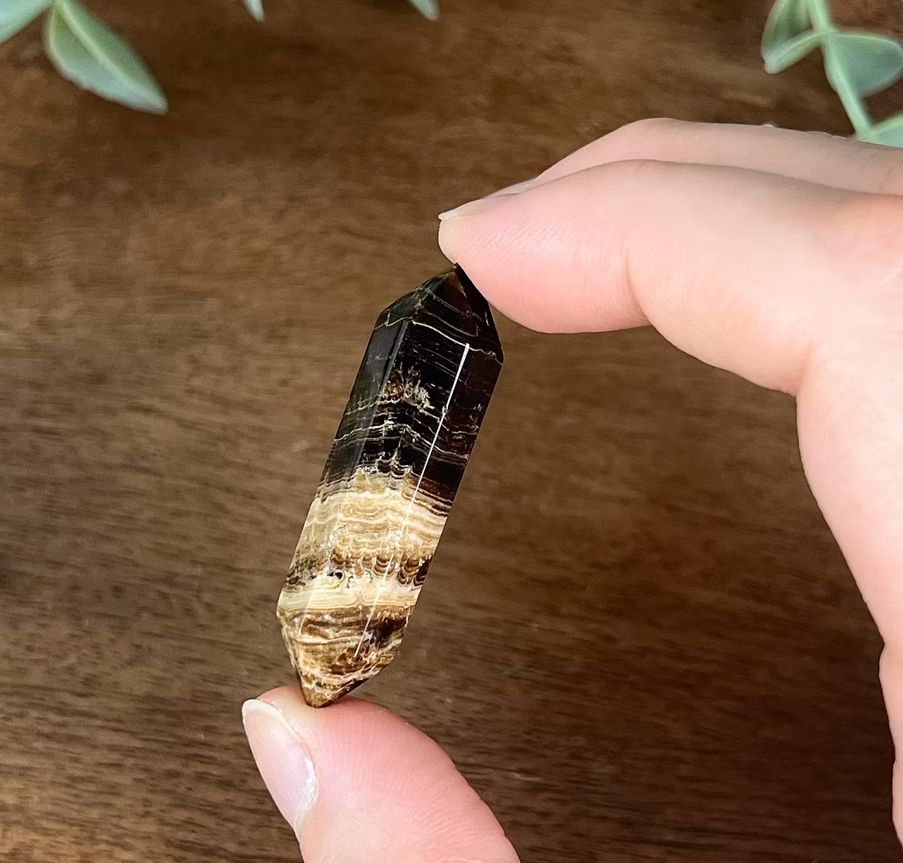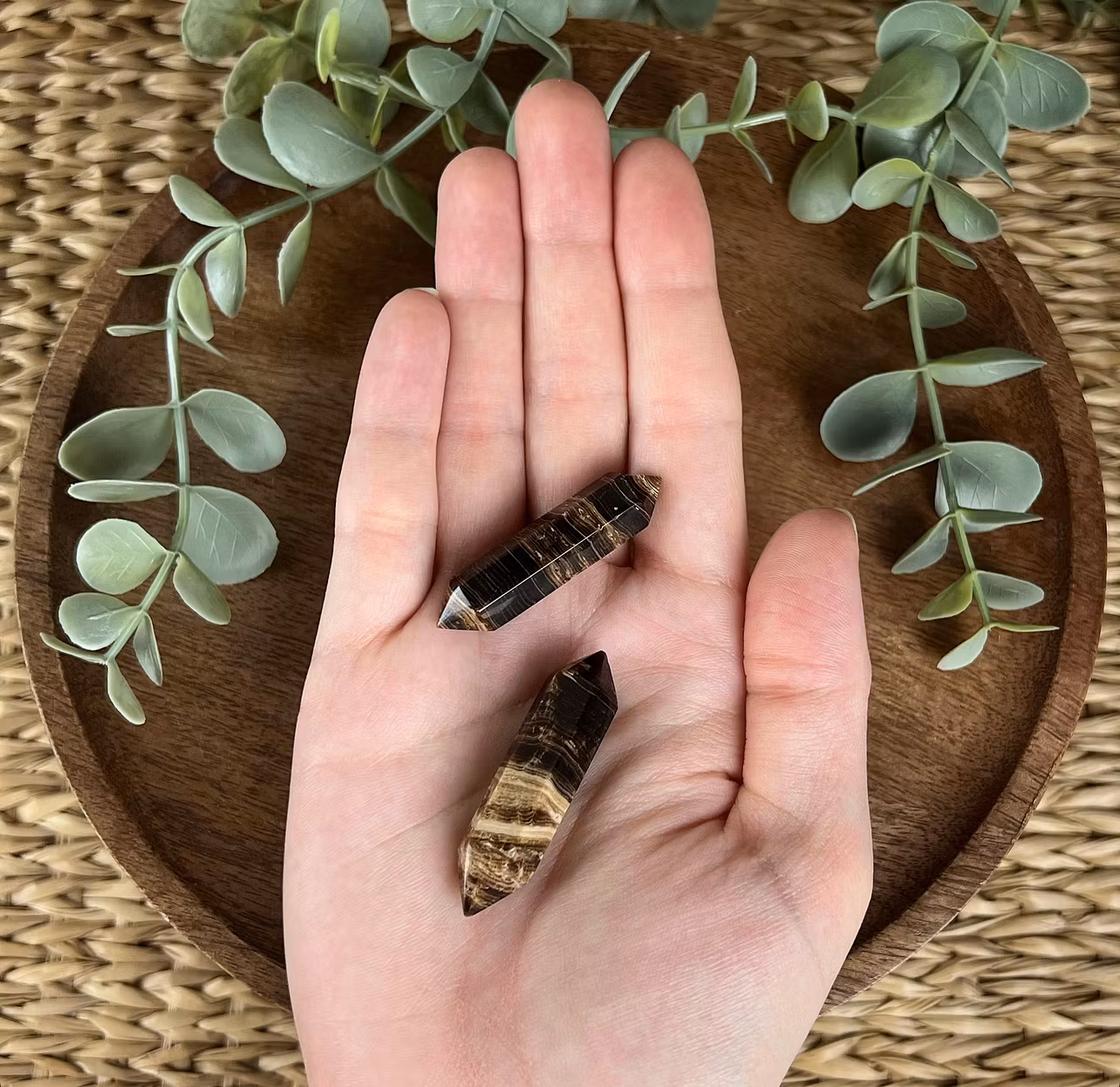 På bilden ser ni dubbelterminerade spetsar av Chokladkalcit av god kvalitét