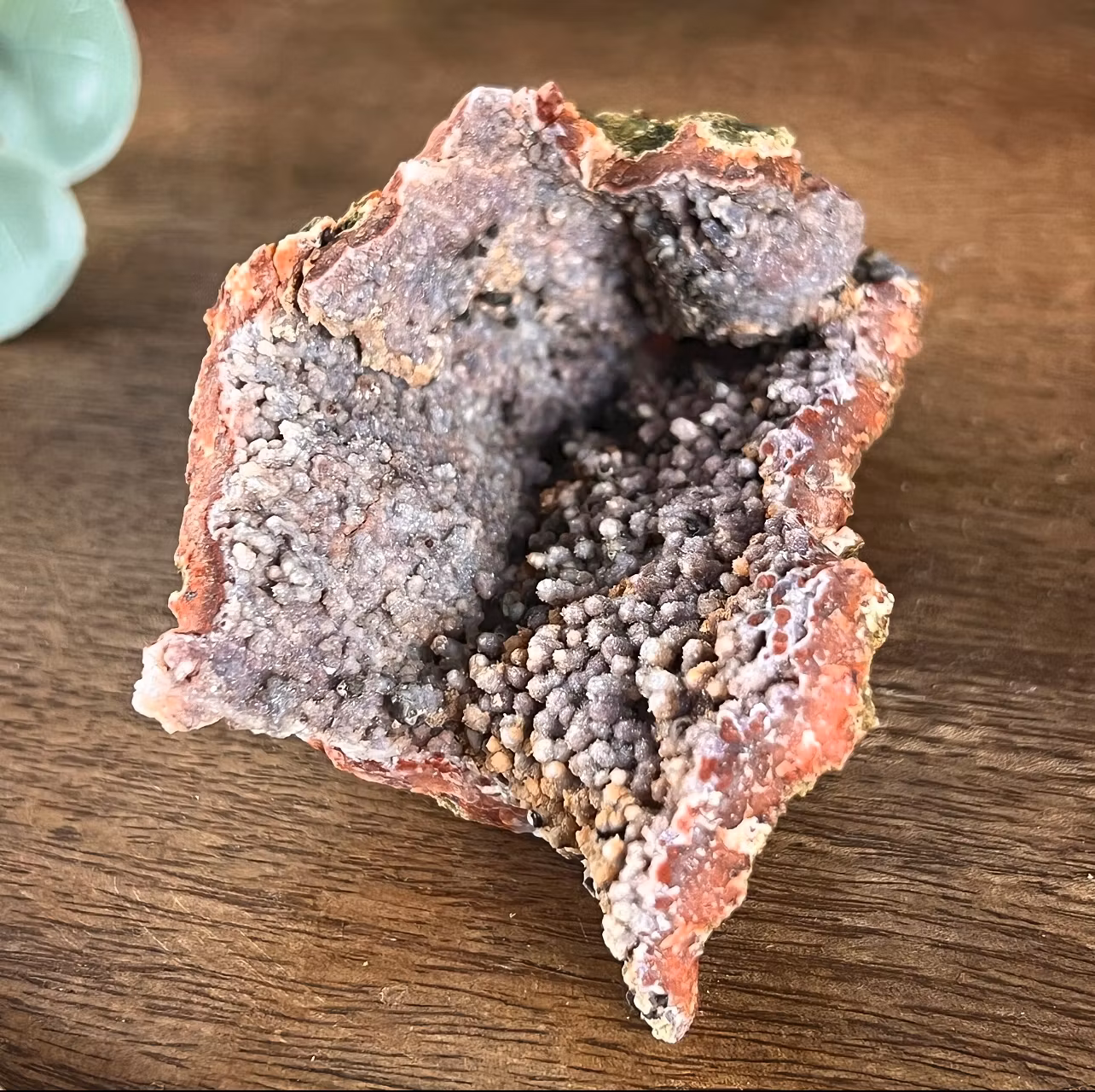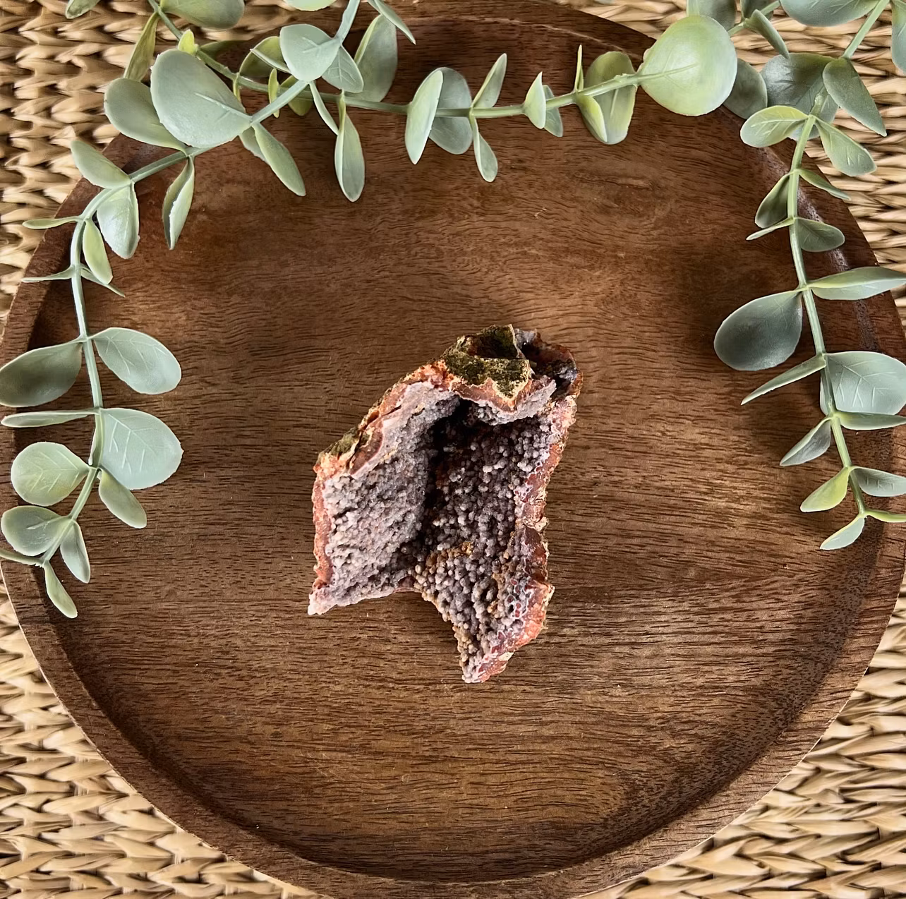 På bilden ser ni en bit av en geod av Berberagat av himla fin kvalitet. Ett kännetecken för just denna agaten är det starkt orange/röda bandet runt kvarts och kalcedon som går i både vita, rosa och lila toner.