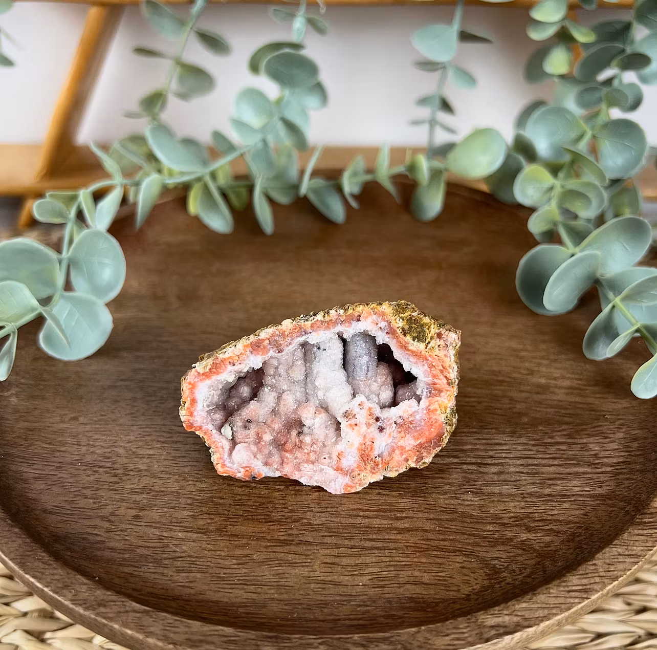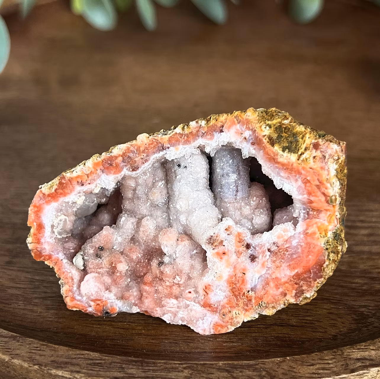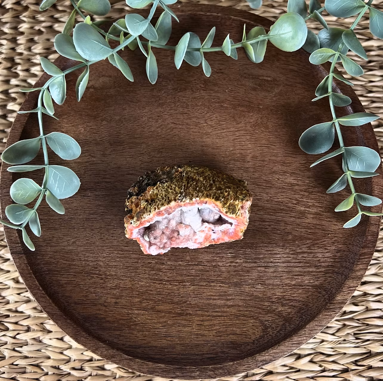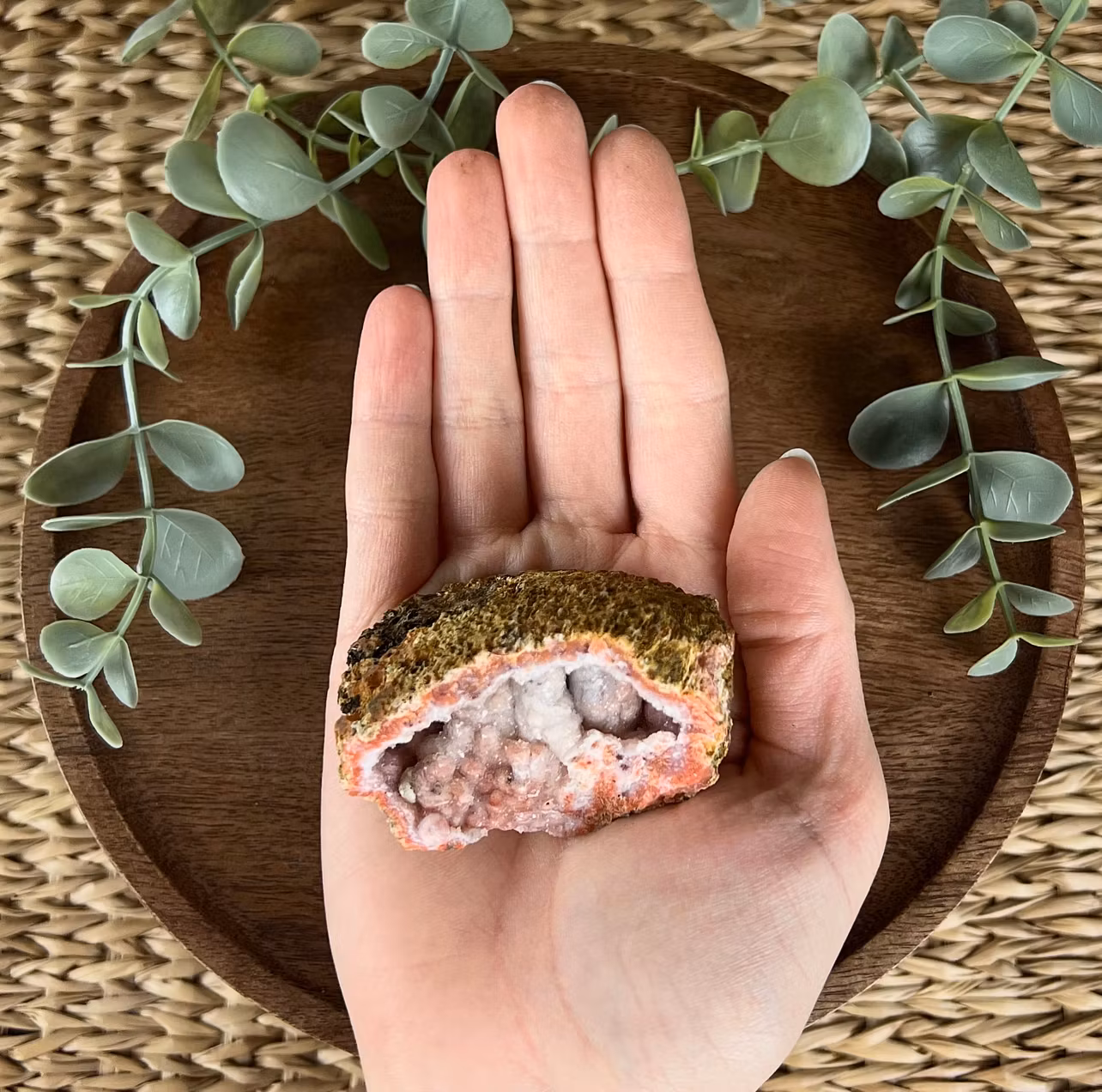 På bilden ser ni en bit av en geod av Berberagat av himla fin kvalitet. Ett kännetecken för just denna agaten är det starkt orange/röda bandet runt kvarts och kalcedon som går i både vita, rosa och lila toner.