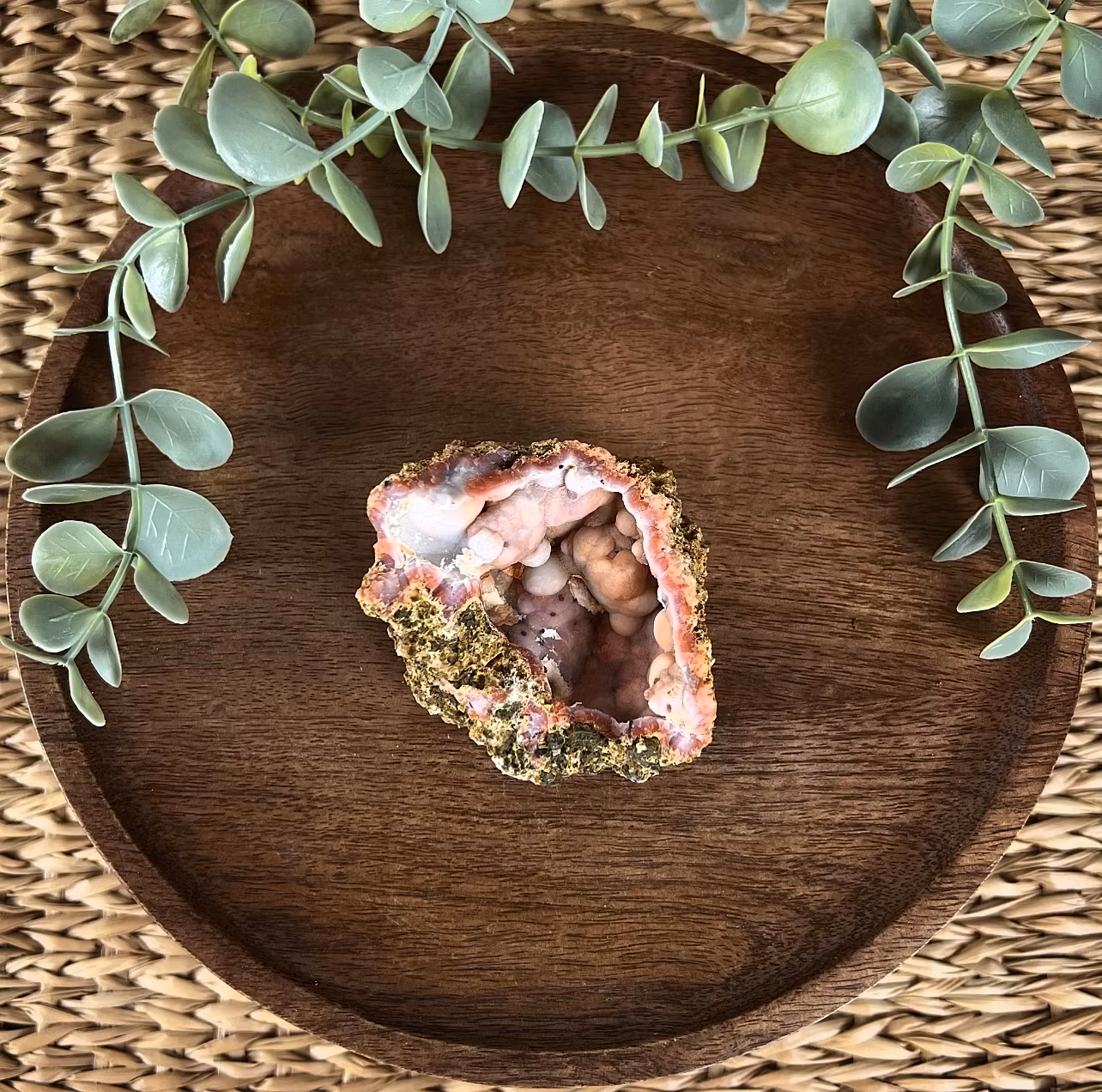 På bilden ser ni en bit av en geod av Berberagat av himla fin kvalitet. Ett kännetecken för just denna agaten är det starkt orange/röda bandet runt kvarts och kalcedon som går i både vita, rosa och lila toner.
