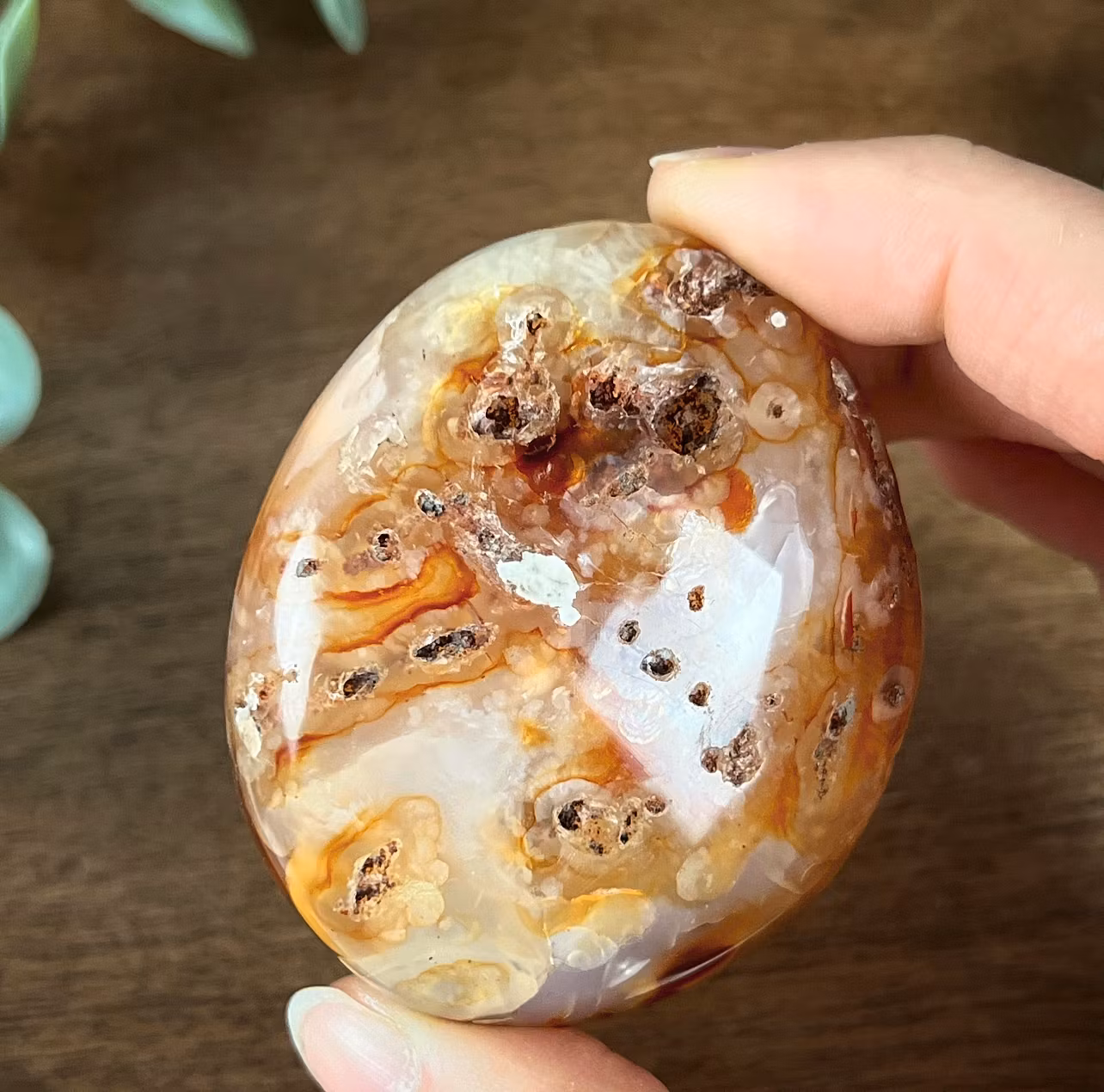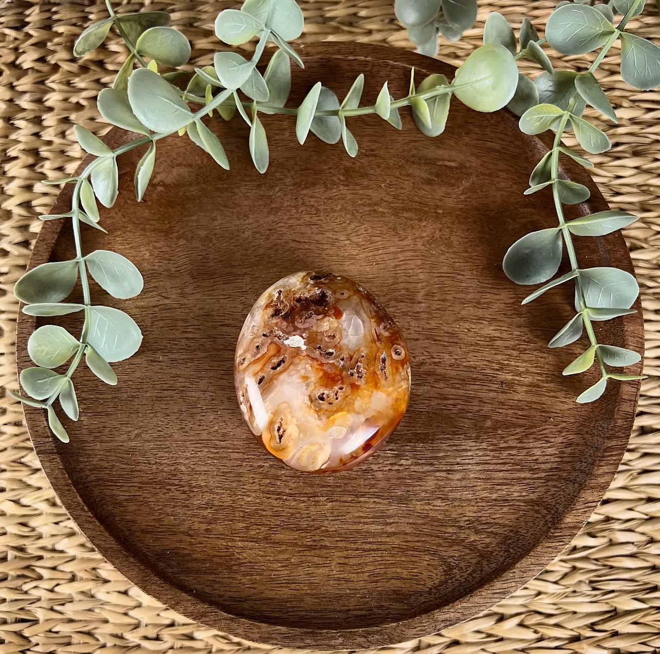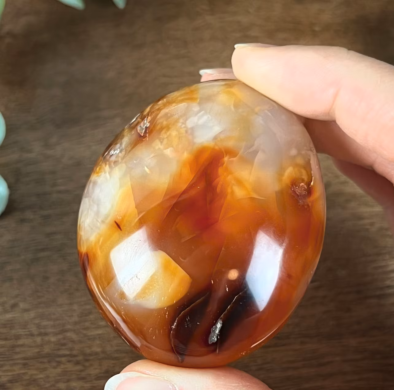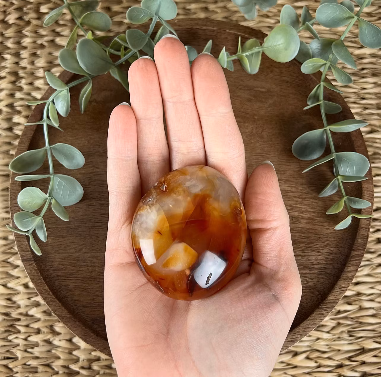 På bilden ser ni en meditationssten (handsten) av Karneol