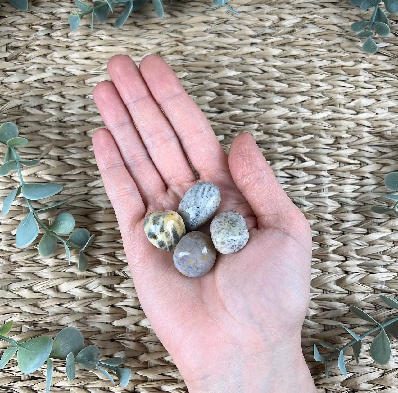 På bilden ser ni mindre trumlade stenar av Crazy Lace agat