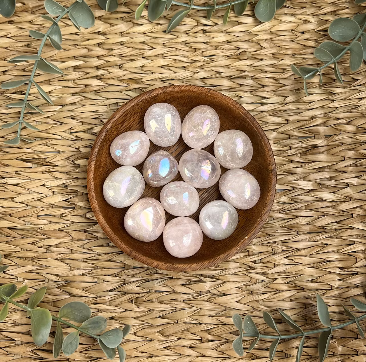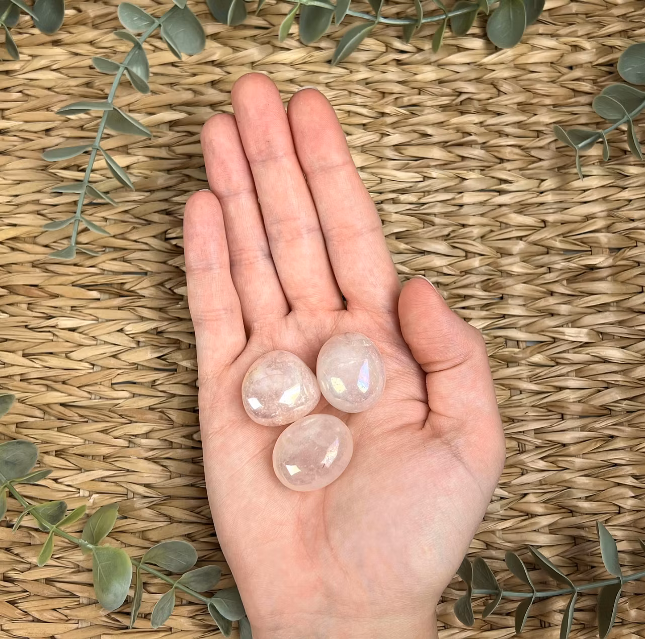 På bilden ser ni mellanstora trumlade stenar av apatit