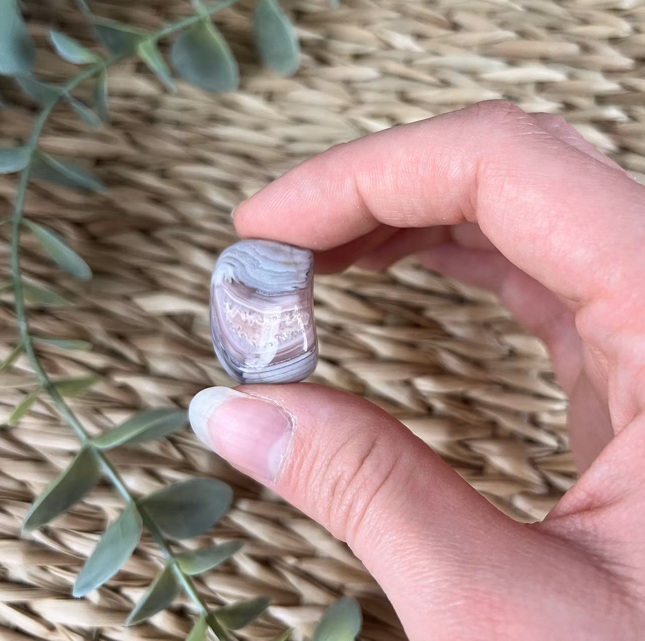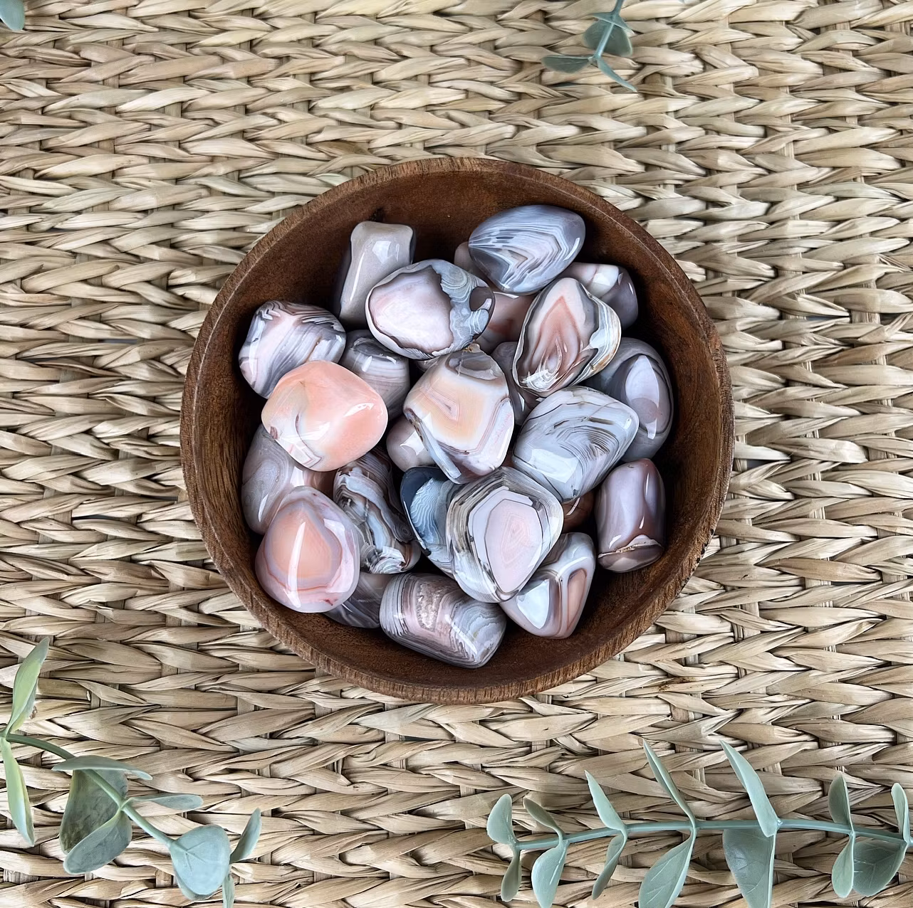 På bilden ser ni trumlade stenar av rosa botswanaagat.