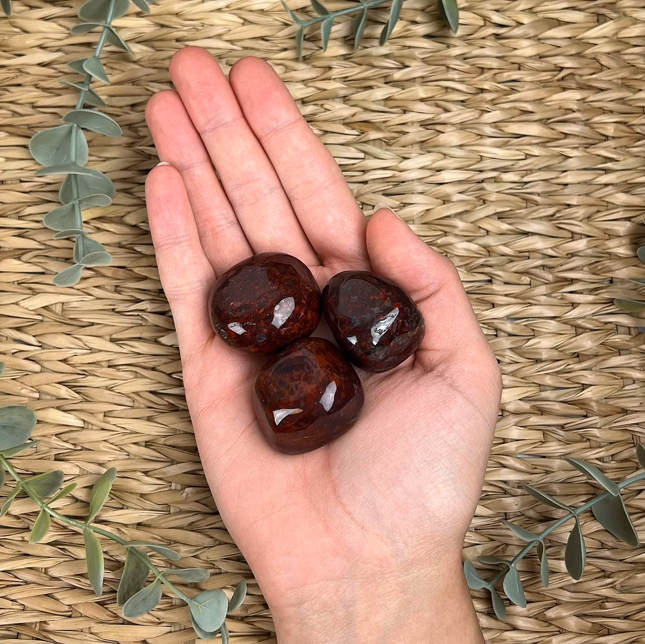 På bilden ser ni stora trumlade stenar av Brecci Jaspis med en väldigt djup blodröd färg