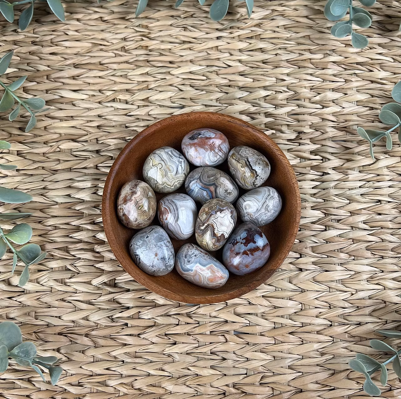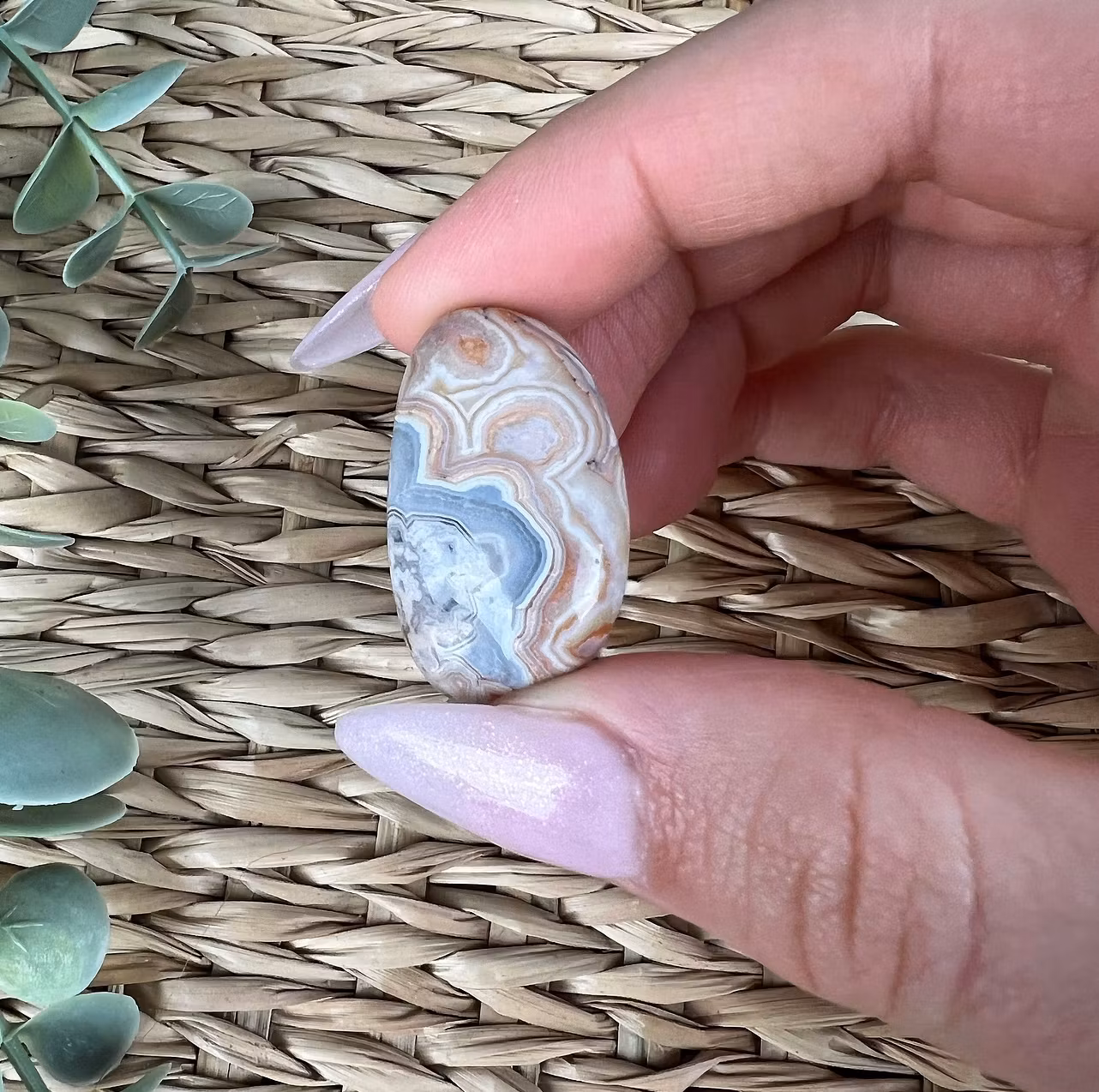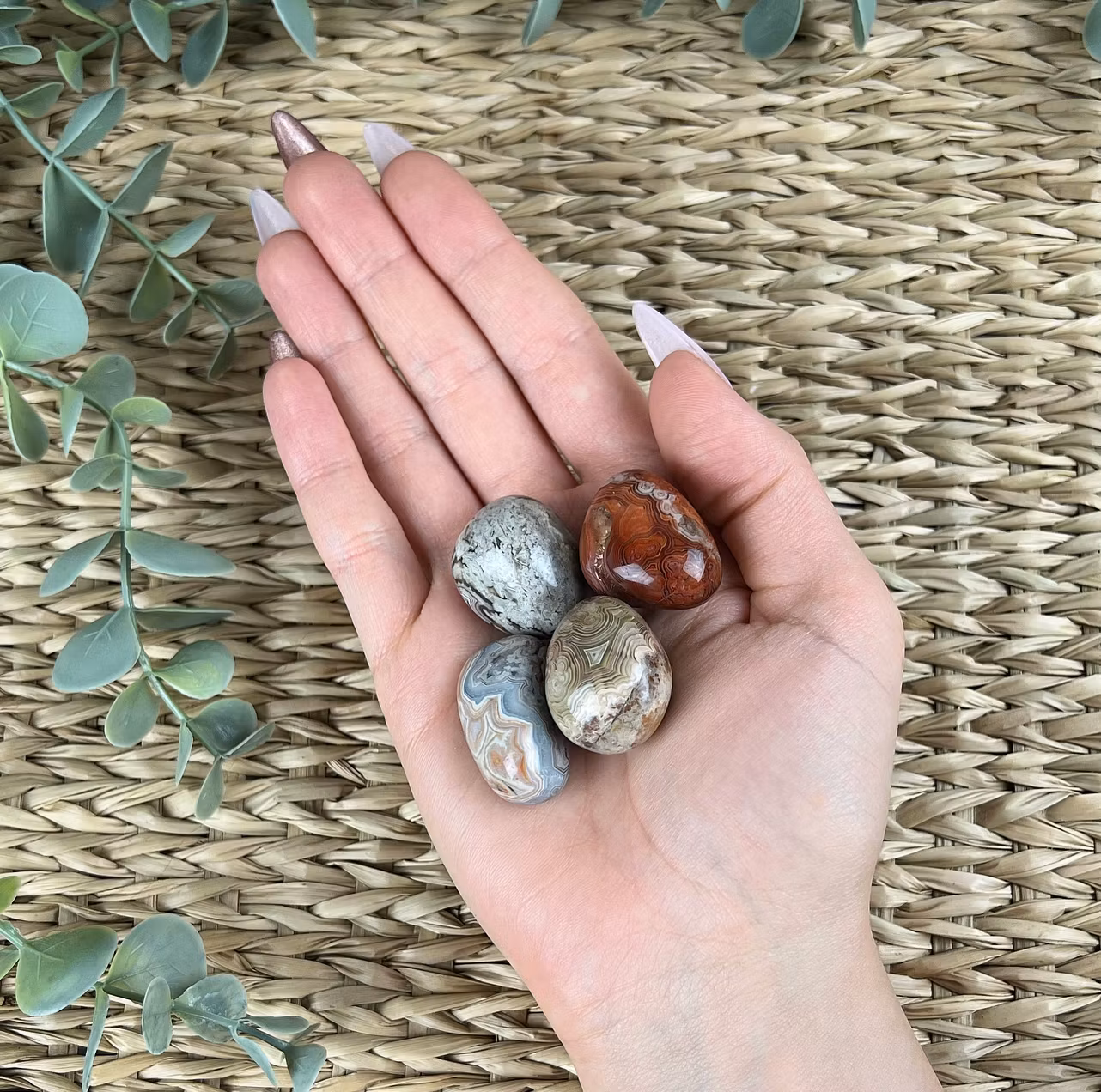 På bilden ser ni "kramisar"/cuddlestones av Crazy Lace agat (även kallad mexikansk agat)