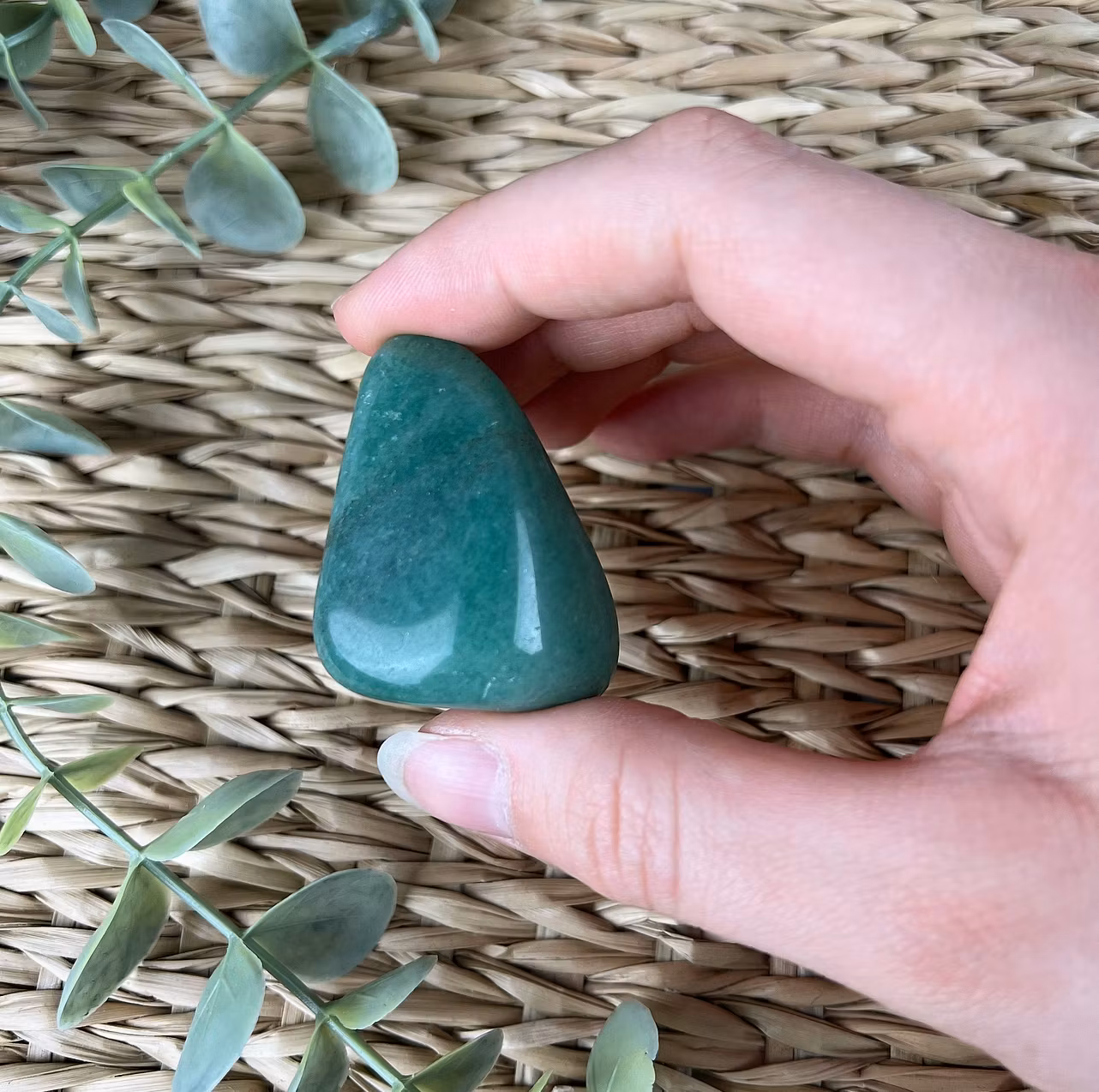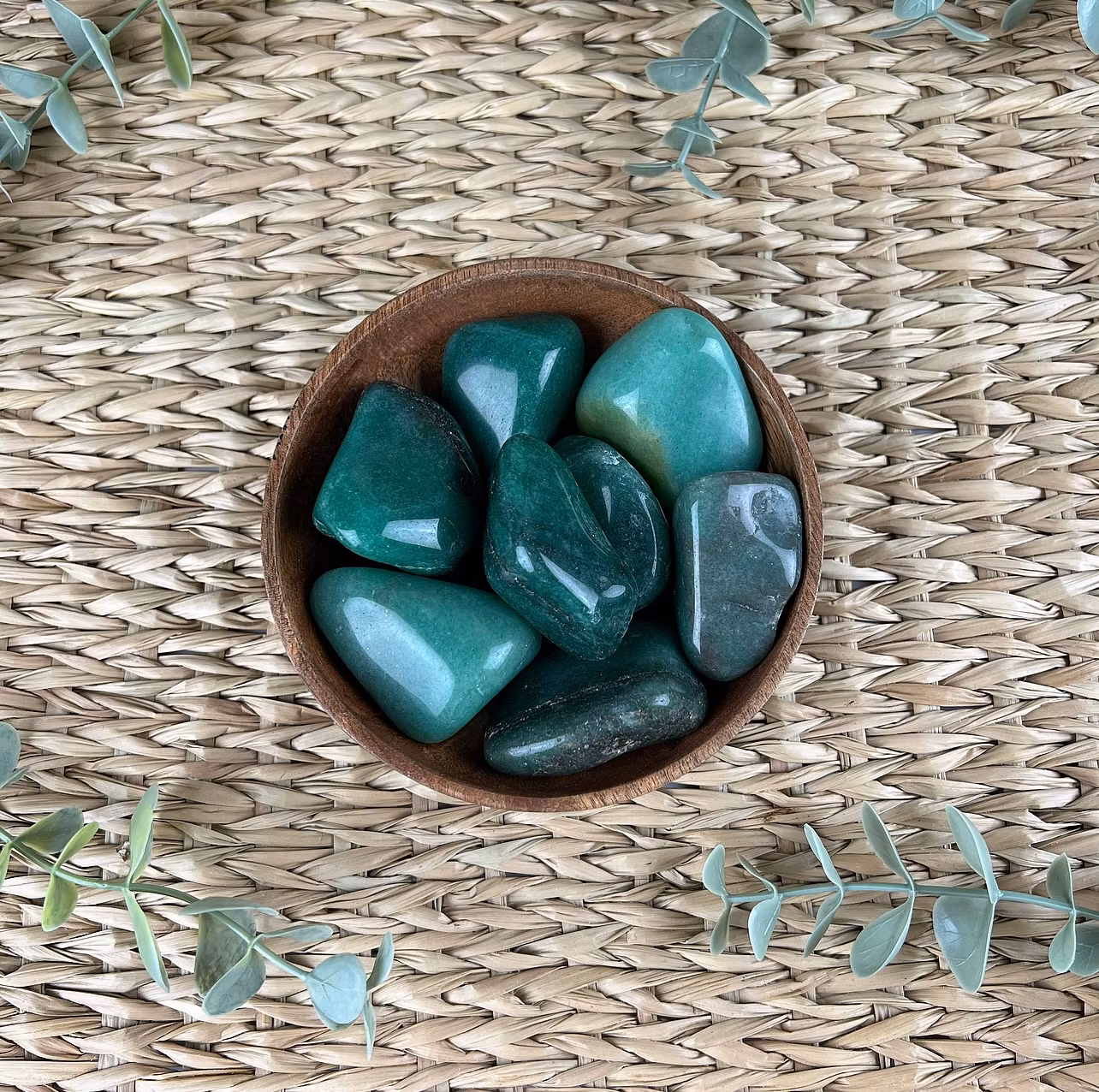 På bilden ser nistörre trumlade stenar av grön aventurin.