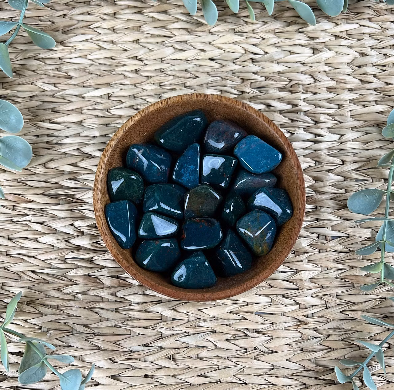 På bilden ser ni mindre trumlade stenar av Heliotrop (även kallad äkta blodsten)