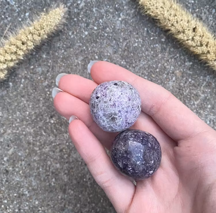 PĂ„ bilden ser ni "kramisar"/cuddlestones i lepidolit