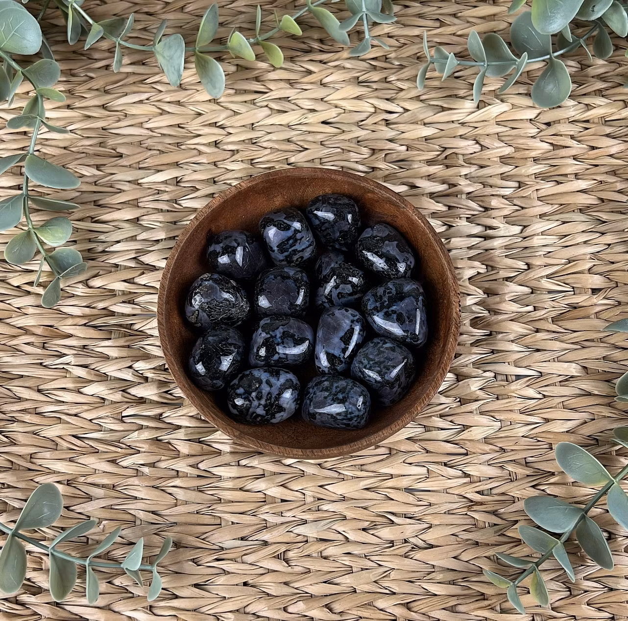 På bilden ser ni trumlade stenar av indigo gabro