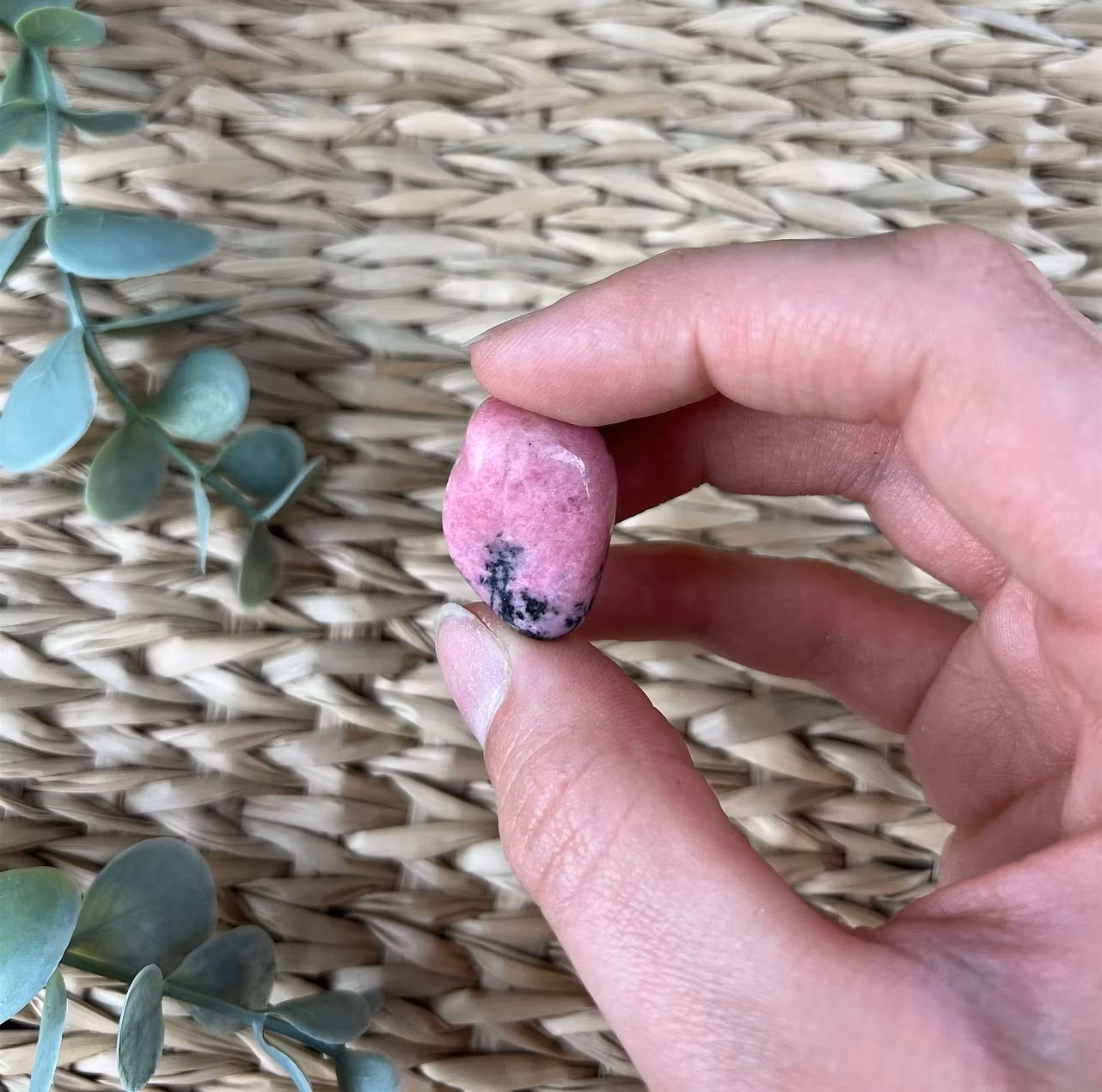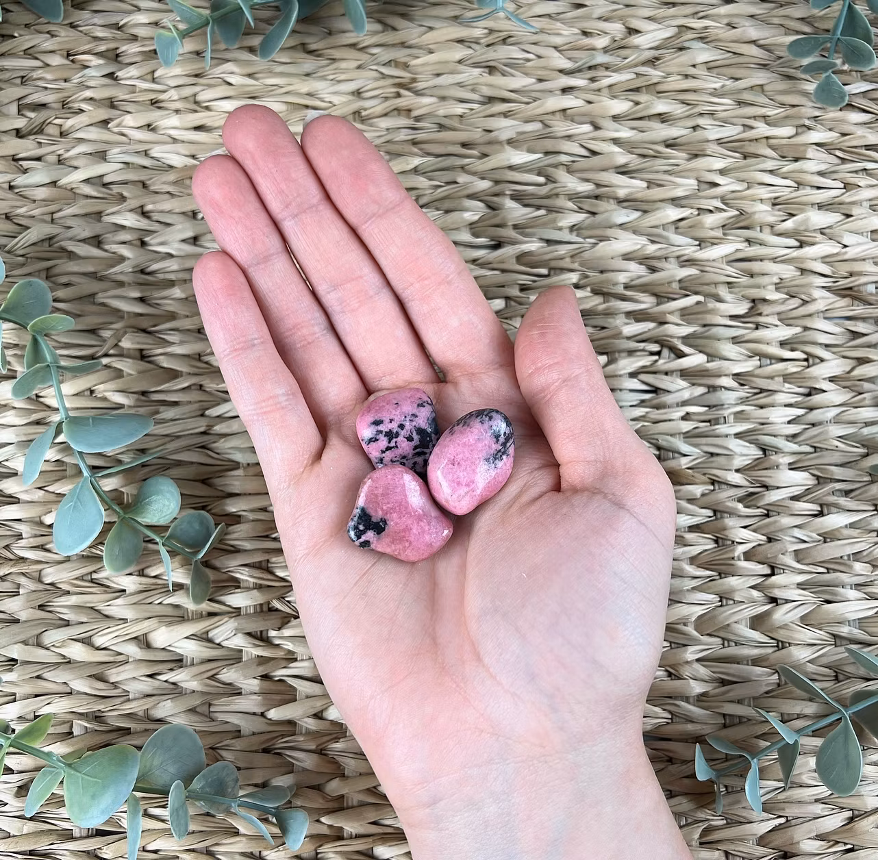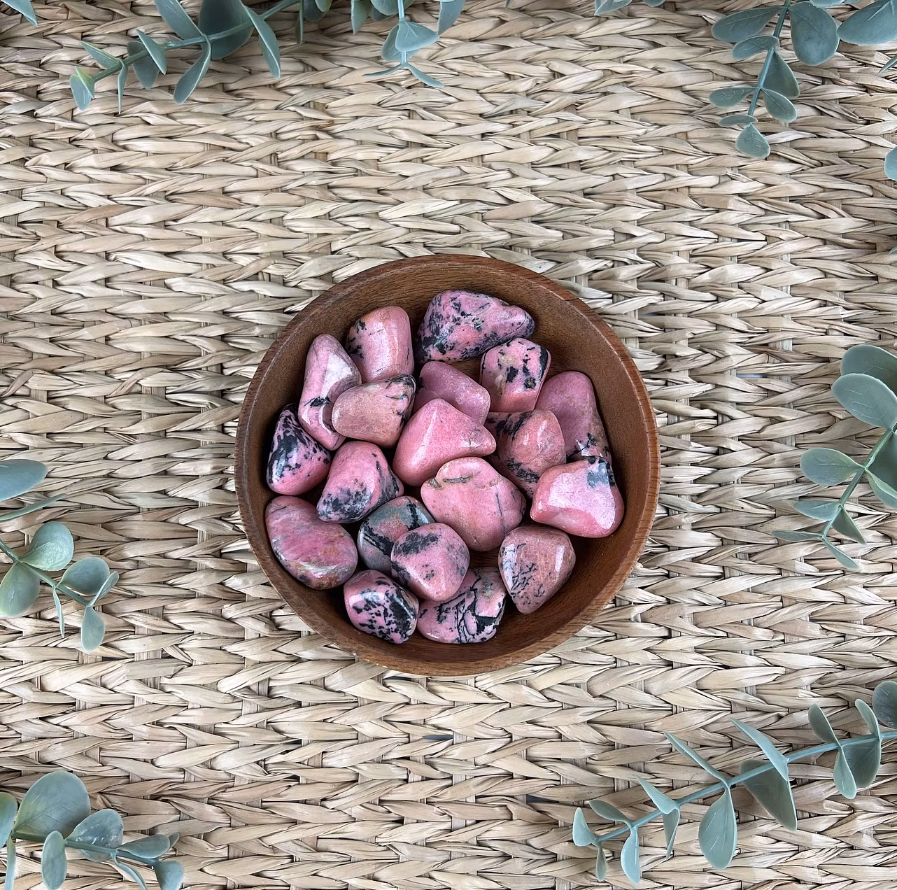 På bilden ser ni mindre trumlade stenar av Rhodonit