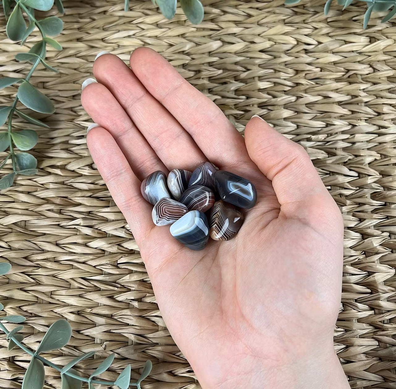 På bilden ser ni mindre trumlade stenar av brun/grå botswanaagat
