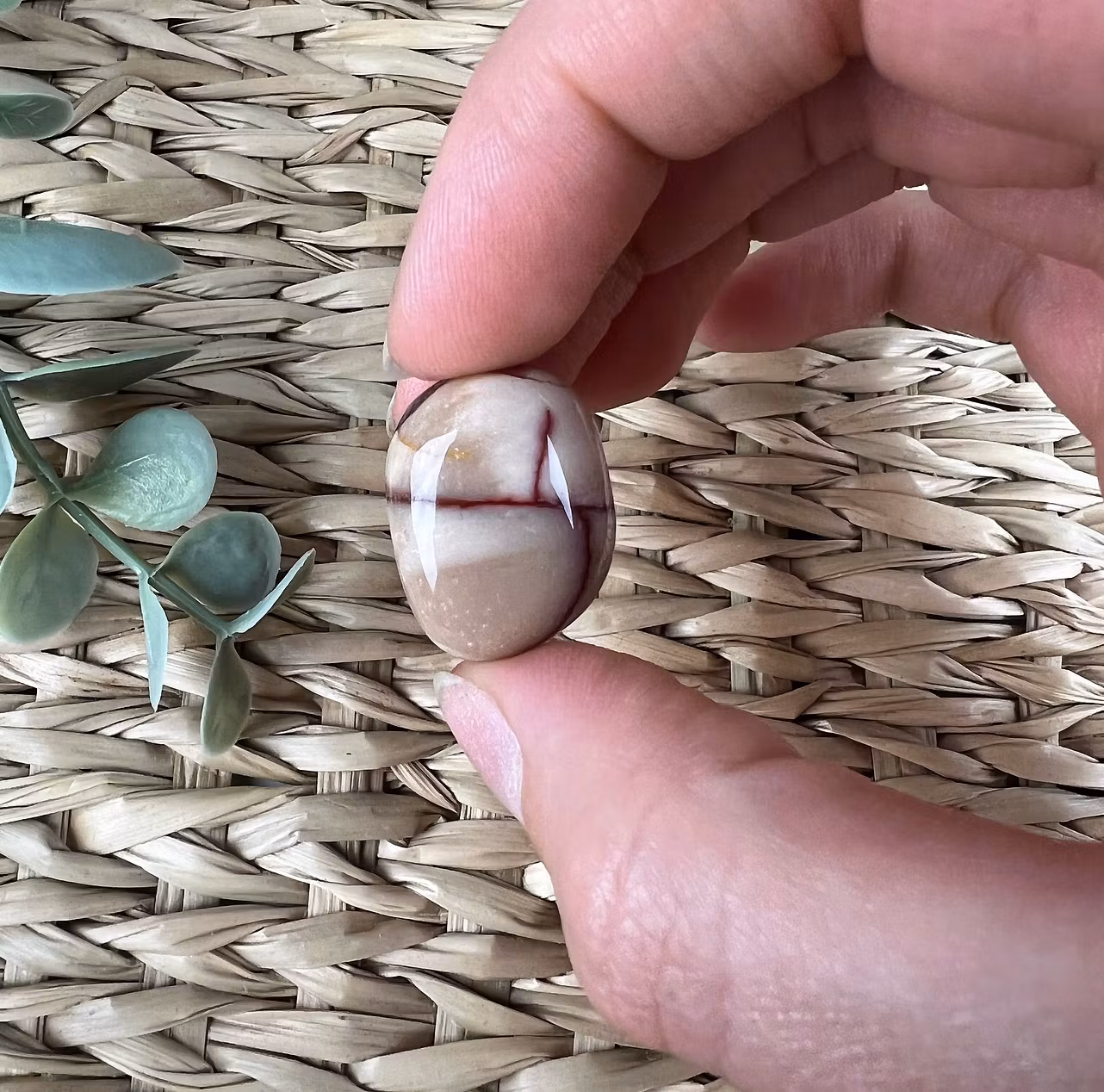 På bilden ser ni mindre trumlade stenar av Mookait Jaspis