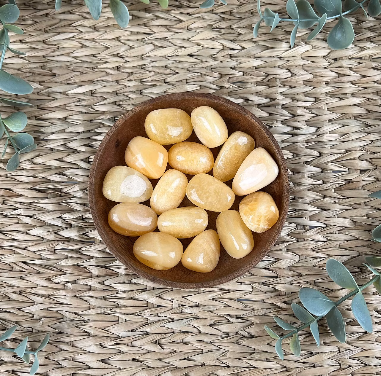 PĂ„ bilden ser ni trumlade stenar av orange kalcit