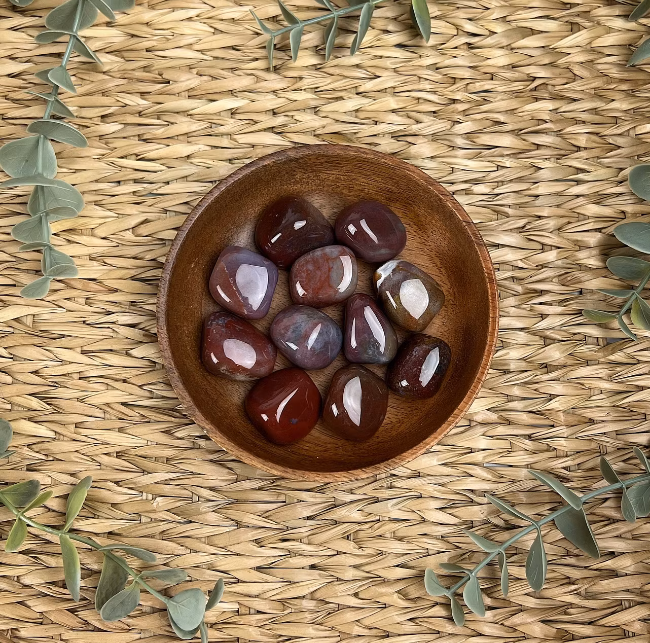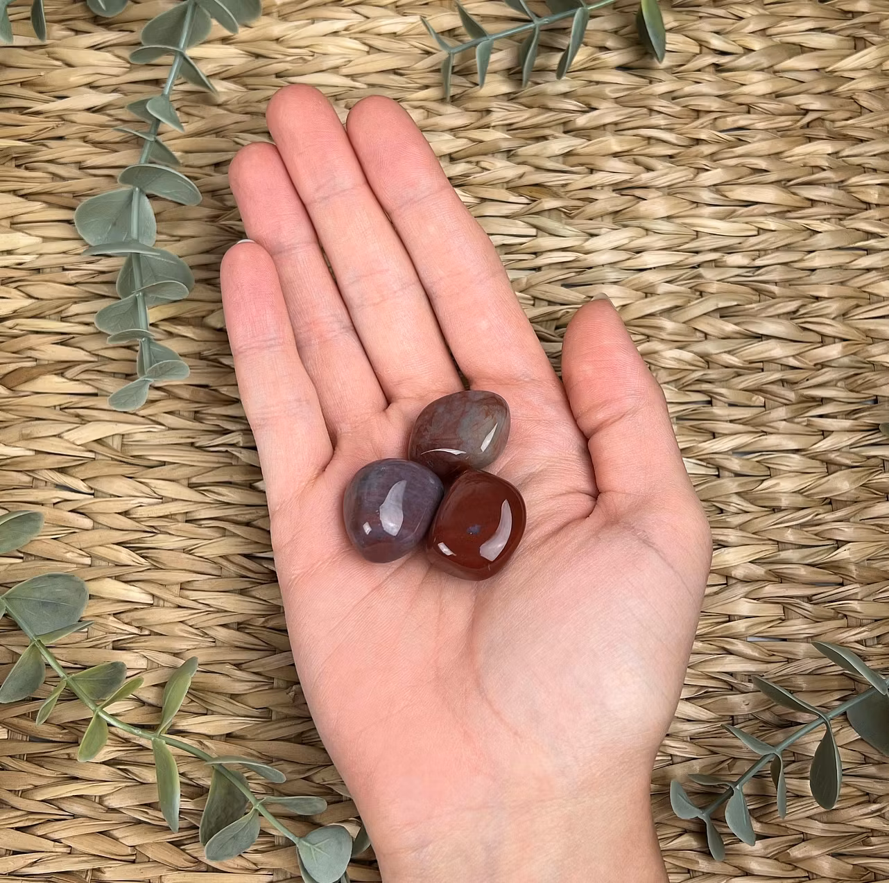 På bilden ser ni mellanstora trumlade stenar av röd kalcedon