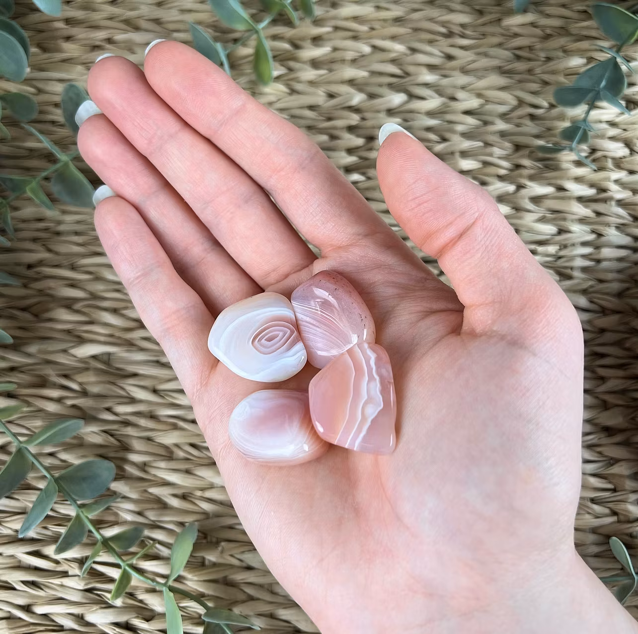 På bilden ser ni trumlade stenar av rosa bandad agat.