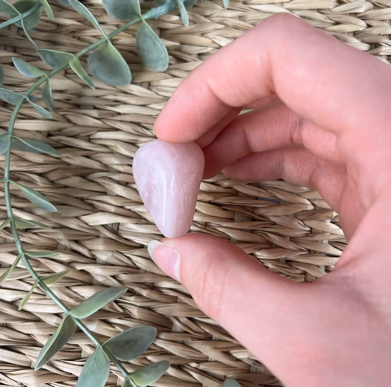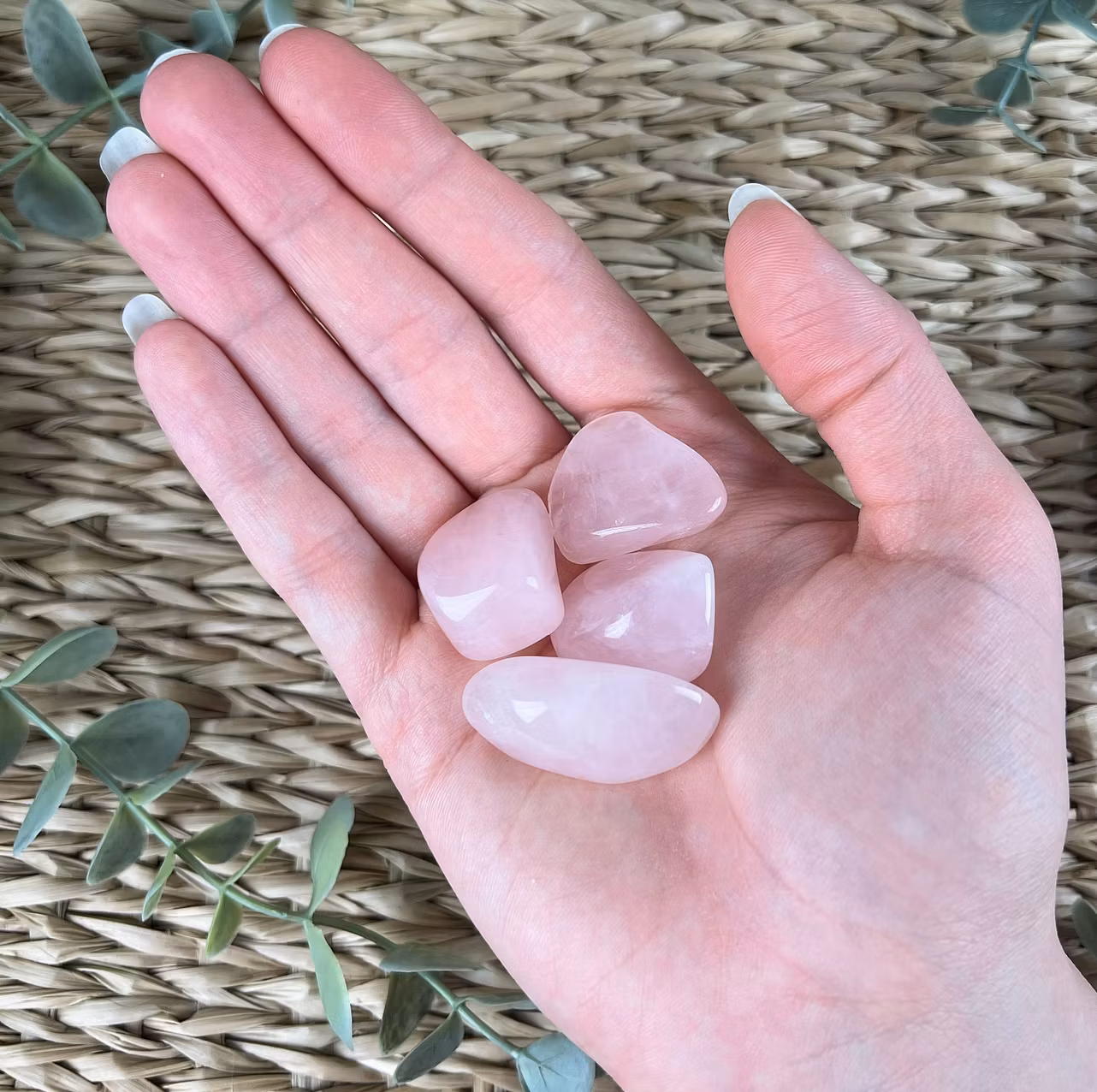 På bilden ser ni trumlade stenar av rosenkvarts.
