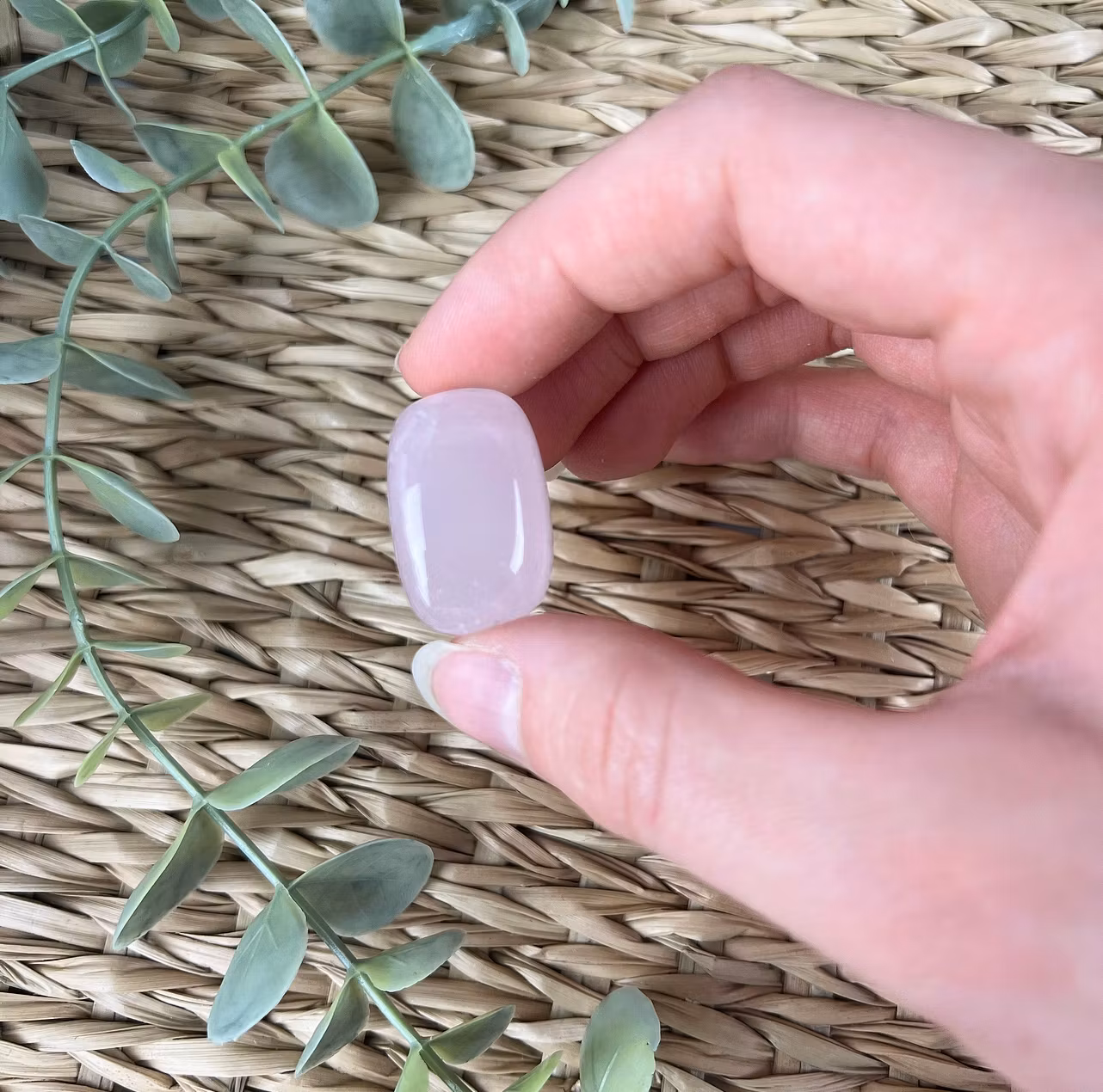 På bilden ser ni trumlade stenar av rosenkvarts.