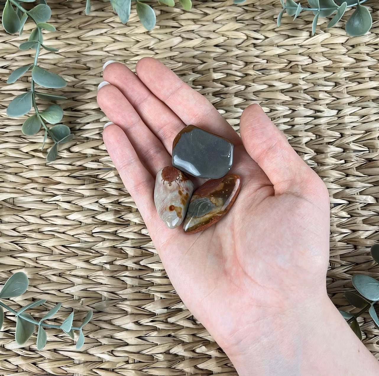 På bilden ser ni större trumlade stenar av polykromjaspis